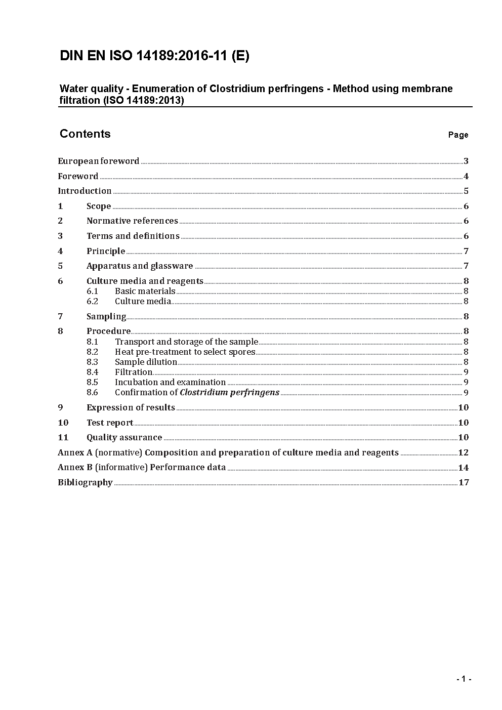 Water quality - Enumeration of Clostridium perfringens - Method using membrane filtration (ISO 14189:2013); German and English version FprEN ISO 14189:2016