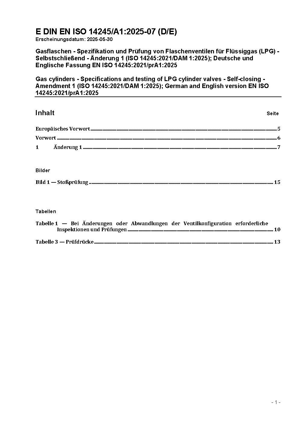 Gasflaschen - Spezifikation und Prüfung von Flaschenventilen für Flüssiggas (LPG) - Selbstschließend - Änderung 1 (ISO 14245:2021/DAM 1:2023); Deutsche und Englische Fassung EN ISO 14245:2021/prA1:2023