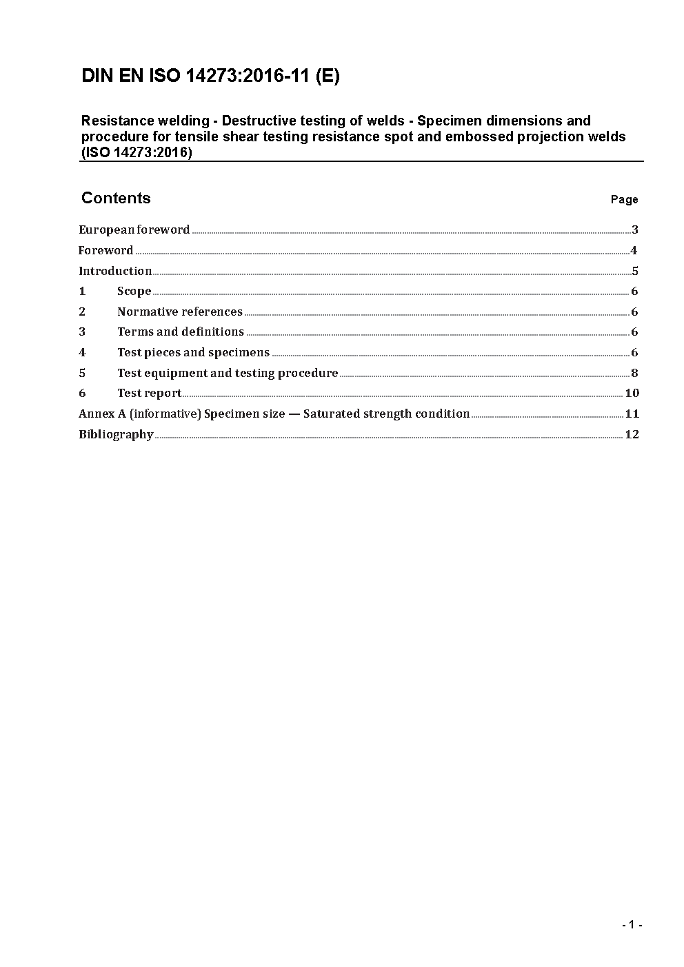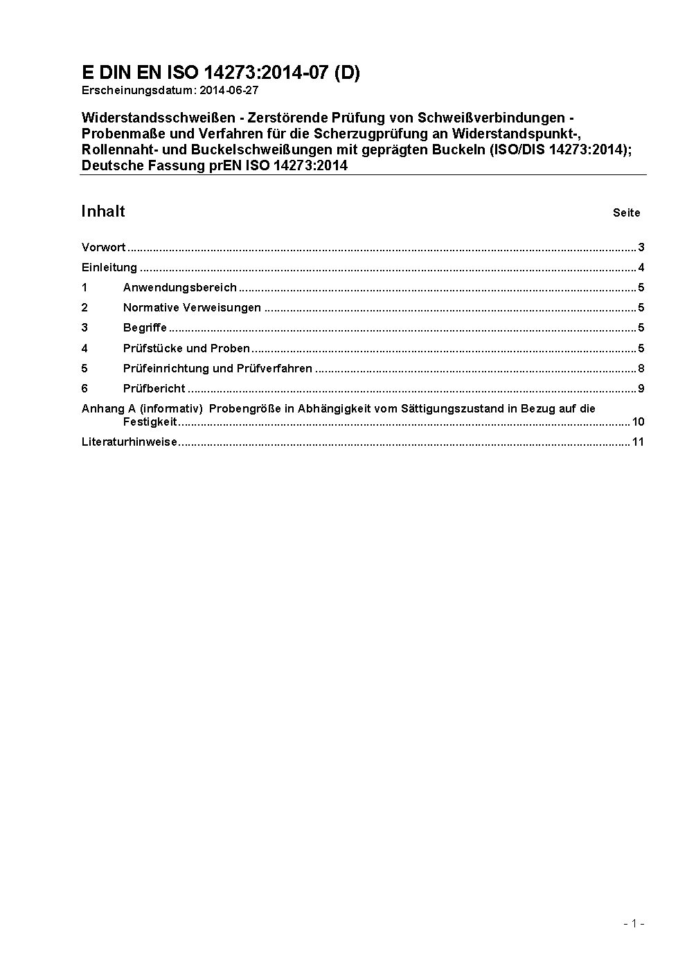 Specimen dimensions and procedure for shear testing resistance spot, seam and embossed projection welds (ISO 14273:2000); German version EN ISO 14273:2002
