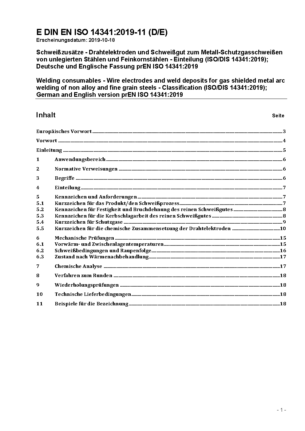 Welding consumables - Wire electrodes and weld deposits for gas shielded metal arc welding of non alloy and fine grain steels - Classification (ISO 14341:2010); German version EN ISO 14341:2011
