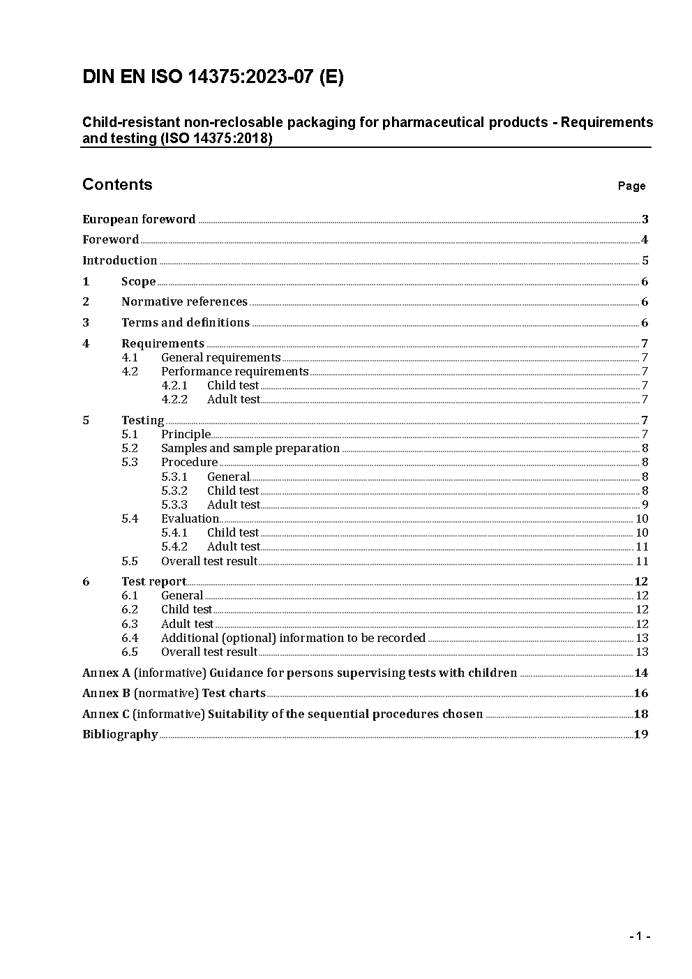 Child-resistant non-reclosable packaging for pharmaceutical products - Requirements and testing (ISO 14375:2018); German and English version prEN ISO 14375:2022