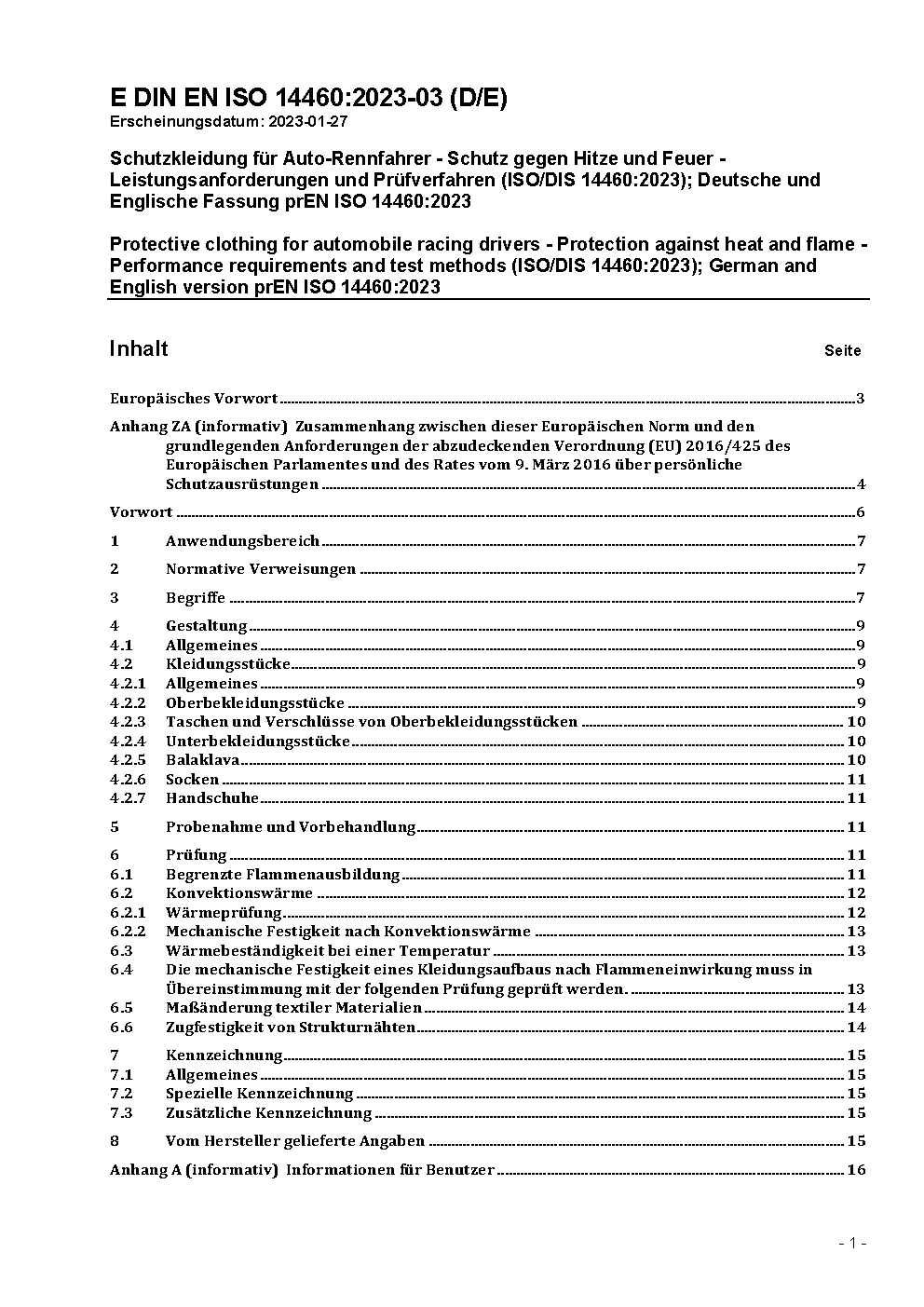 Protective clothing for automobile racing drivers - Performance requirements and test methods (ISO/DIS 14460:1996); German version prEN ISO 14460:1996
