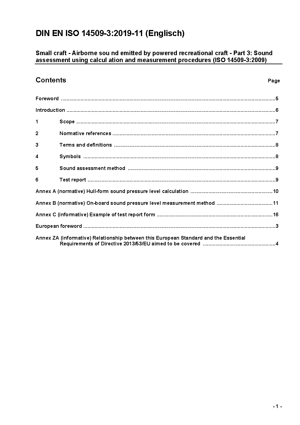 Small craft - Airborne sound emitted by powered recreational craft - Part 3: Sound assessment using calculation and measurement procedures (ISO 14509-3:2009); German version EN ISO 14509-3:2009