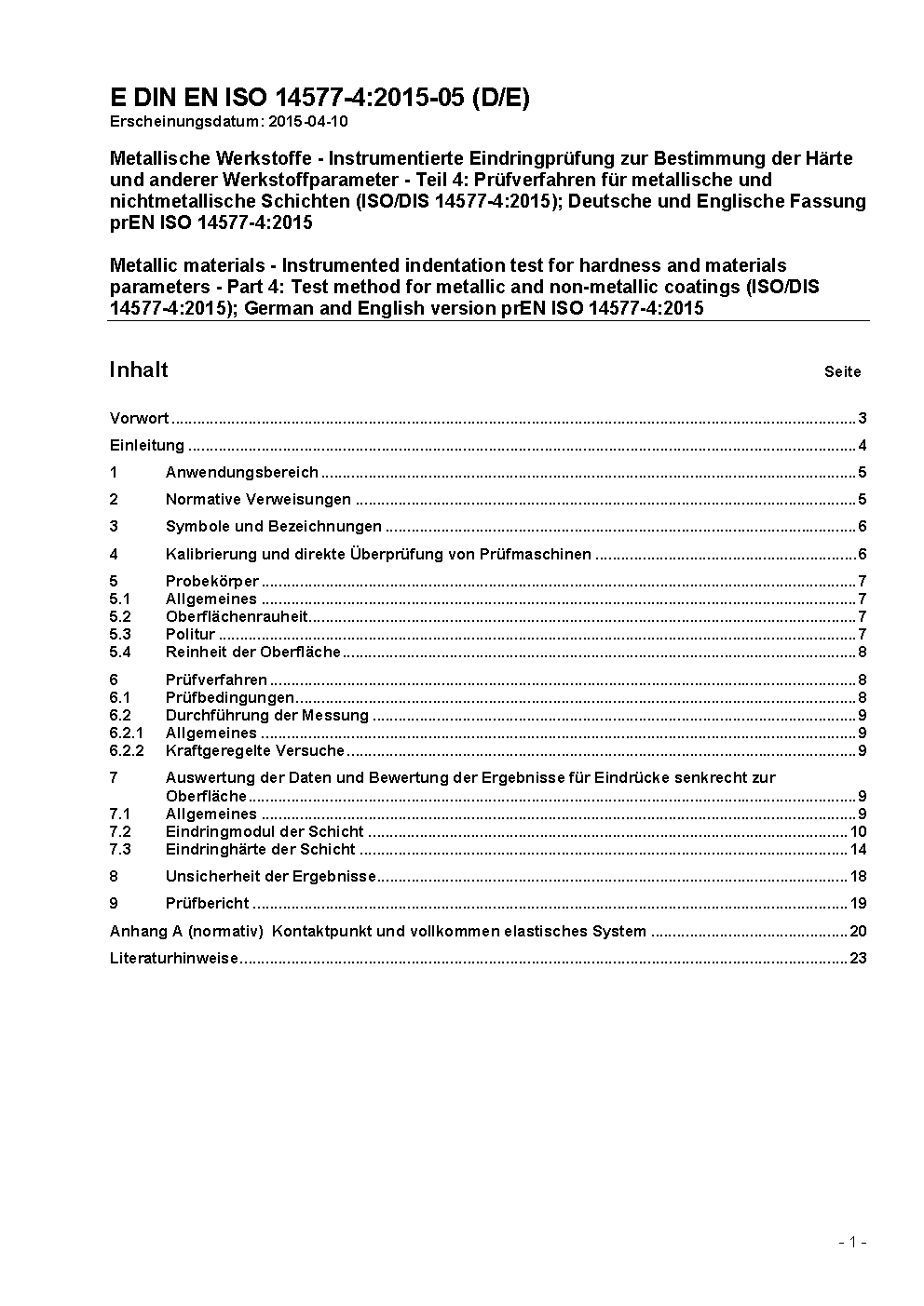 Metallische Werkstoffe - Instrumentierte Eindringprüfung zur Bestimmung der Härte und anderer Werkstoffparameter - Teil 4: Prüfverfahren für metallische und nichtmetallische Schichten (ISO 14577-4:2016); Deutsche Fassung EN ISO 14577-4:2016