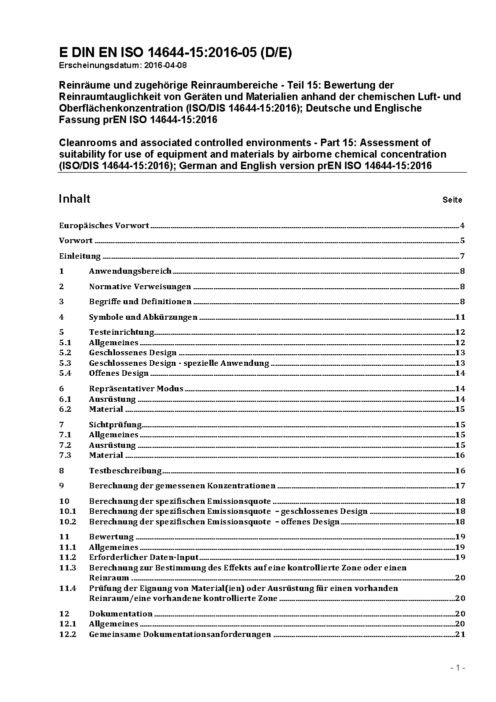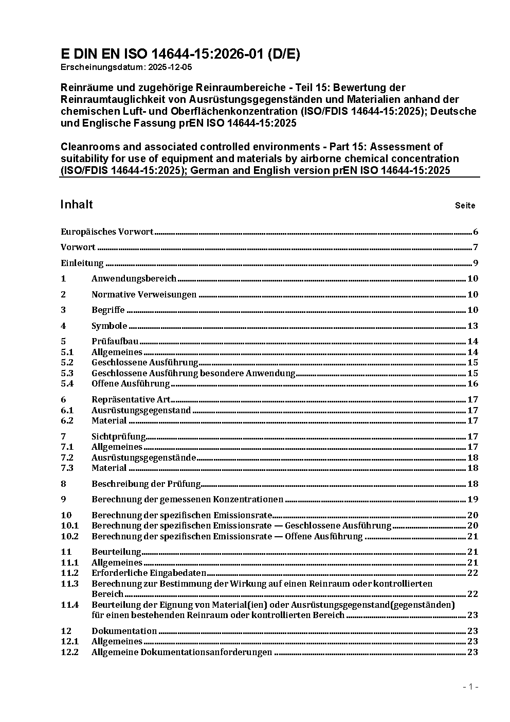 Reinräume und zugehörige Reinraumbereiche - Teil 15: Bewertung der Reinraumtauglichkeit von Ausrüstungsgegenständen und Materialien anhand der chemischen Luft- und Oberflächenkonzentration (ISO/FDIS 14644-15:2025); Deutsche und Englische Fassung prEN ISO 14644-15:2025