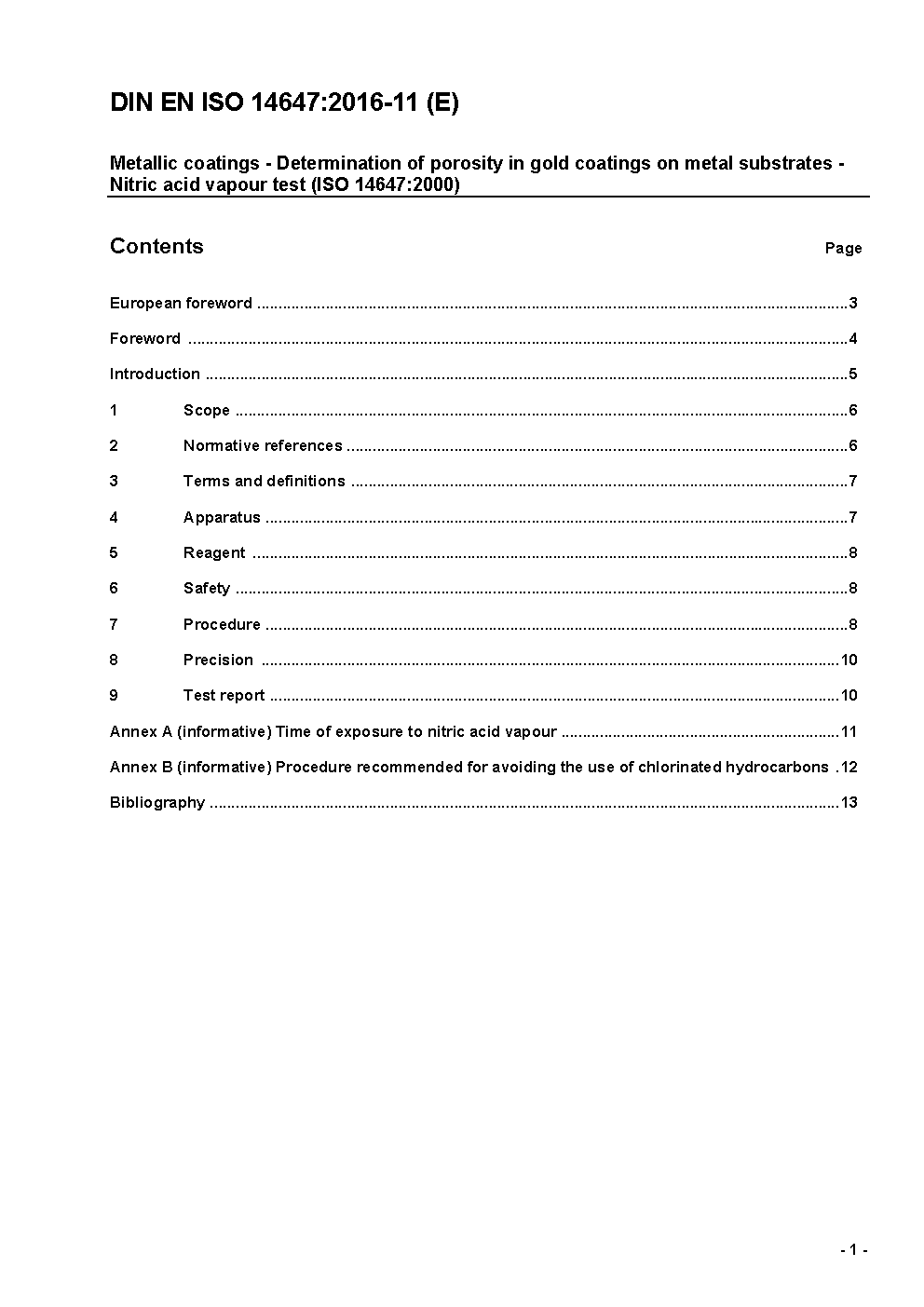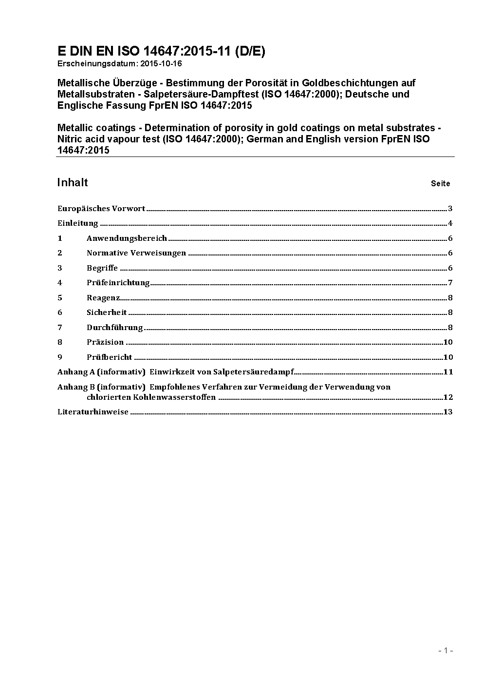 Metallic coatings - Determination of porosity in gold coatings on metal substrates - Nitric acid vapour test (ISO 14647:2000); German and English version FprEN ISO 14647:2015