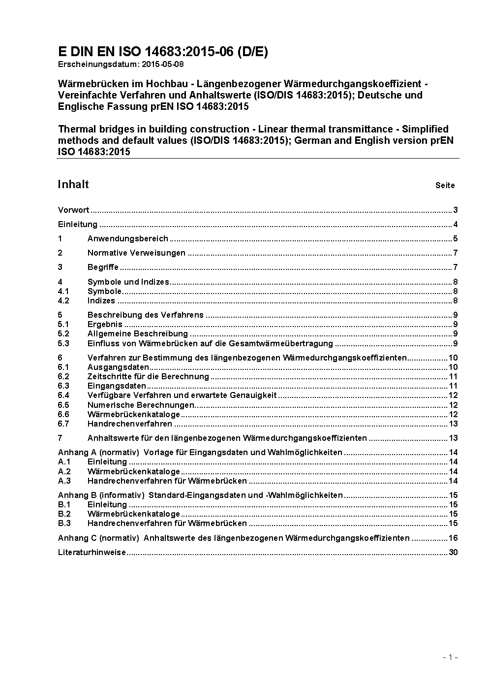 Wärmebrücken im Hochbau - Längenbezogener Wärmedurchgangskoeffizient - Vereinfachte Verfahren und Anhaltswerte (ISO 14683:2007); Deutsche Fassung EN ISO 14683:2007
