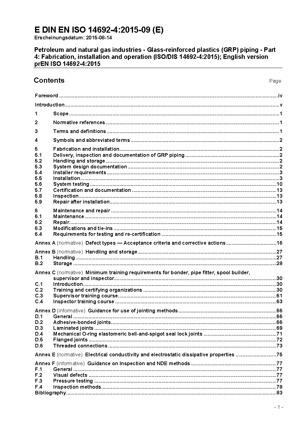 Petroleum and natural gas industries - Glass-reinforced plastics (GRP) piping - Part 4: Fabrication, installation and operation (ISO 14692-4:2017); English version EN ISO 14692-4:2017