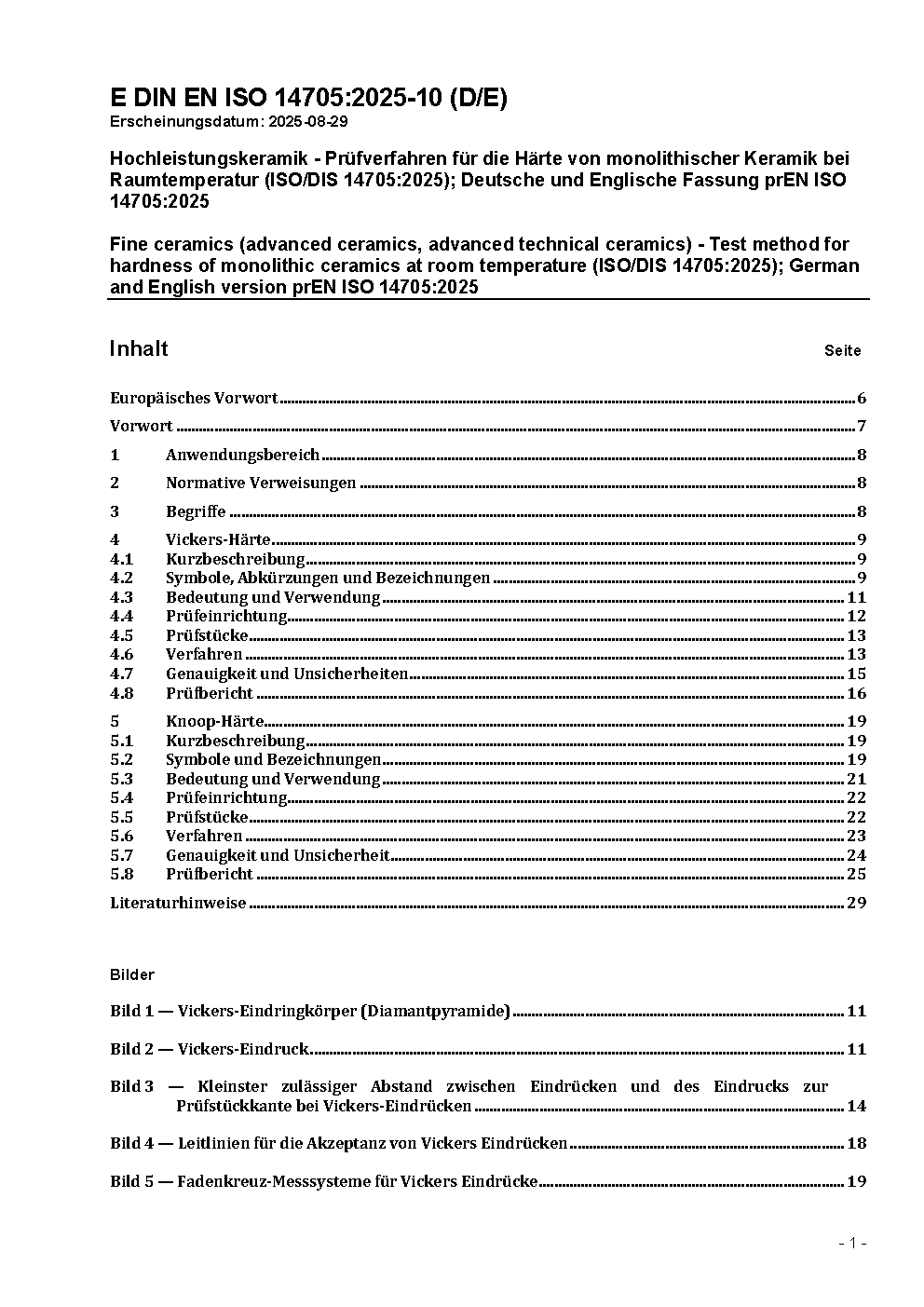 Hochleistungskeramik - Härteprüfung von monolithischer Keramik bei Raumtemperatur (ISO 14705:2016); Deutsche und Englische Fassung prEN ISO 14705:2020