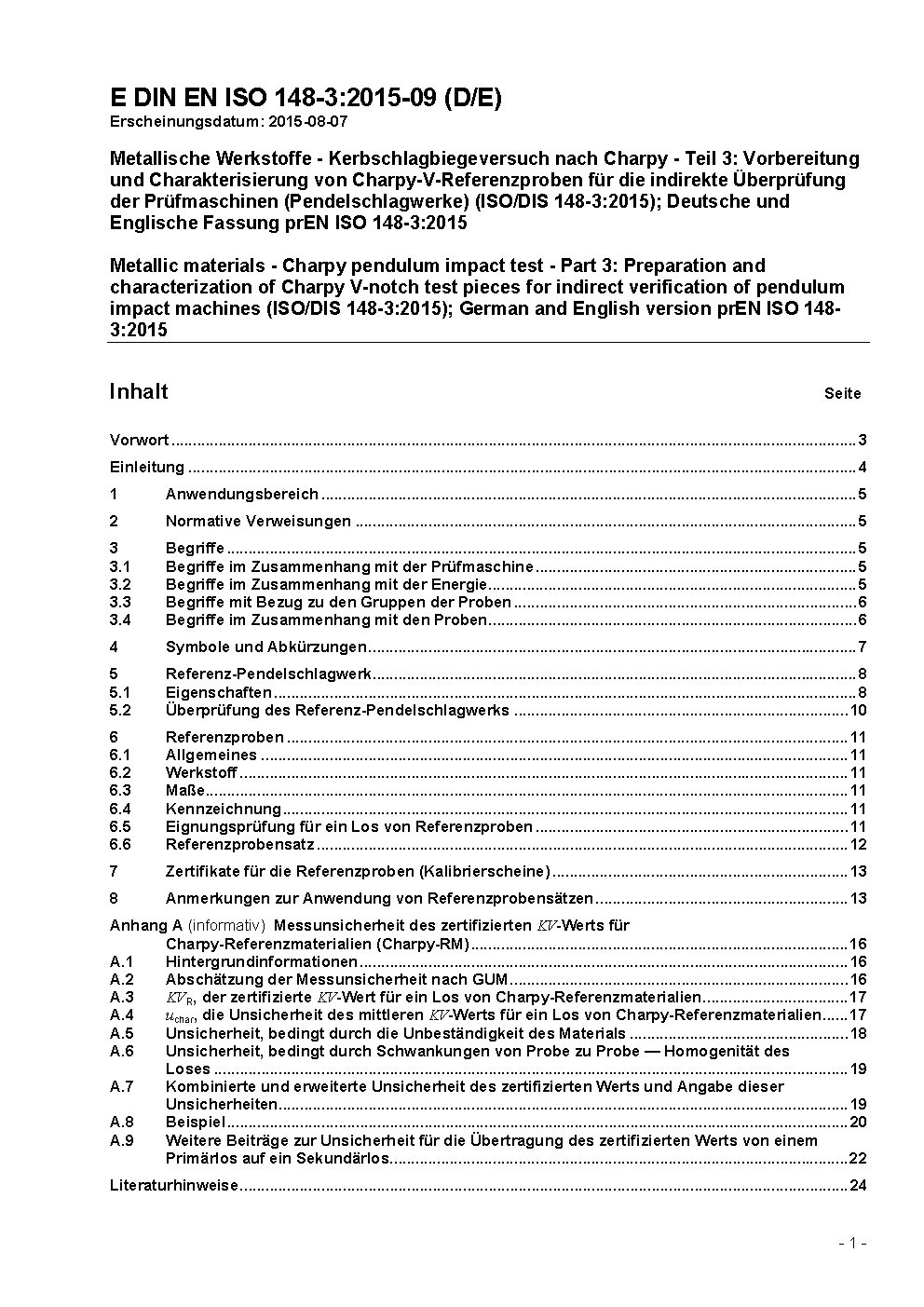 Metallische Werkstoffe - Kerbschlagbiegeversuch nach Charpy - Teil 3: Vorbereitung und Charakterisierung von Charpy-V-Referenzproben für die indirekte Überprüfung der Prüfmaschinen (Pendelschlagwerke) (ISO 148-3:2016); Deutsche Fassung EN ISO 148-3:2016