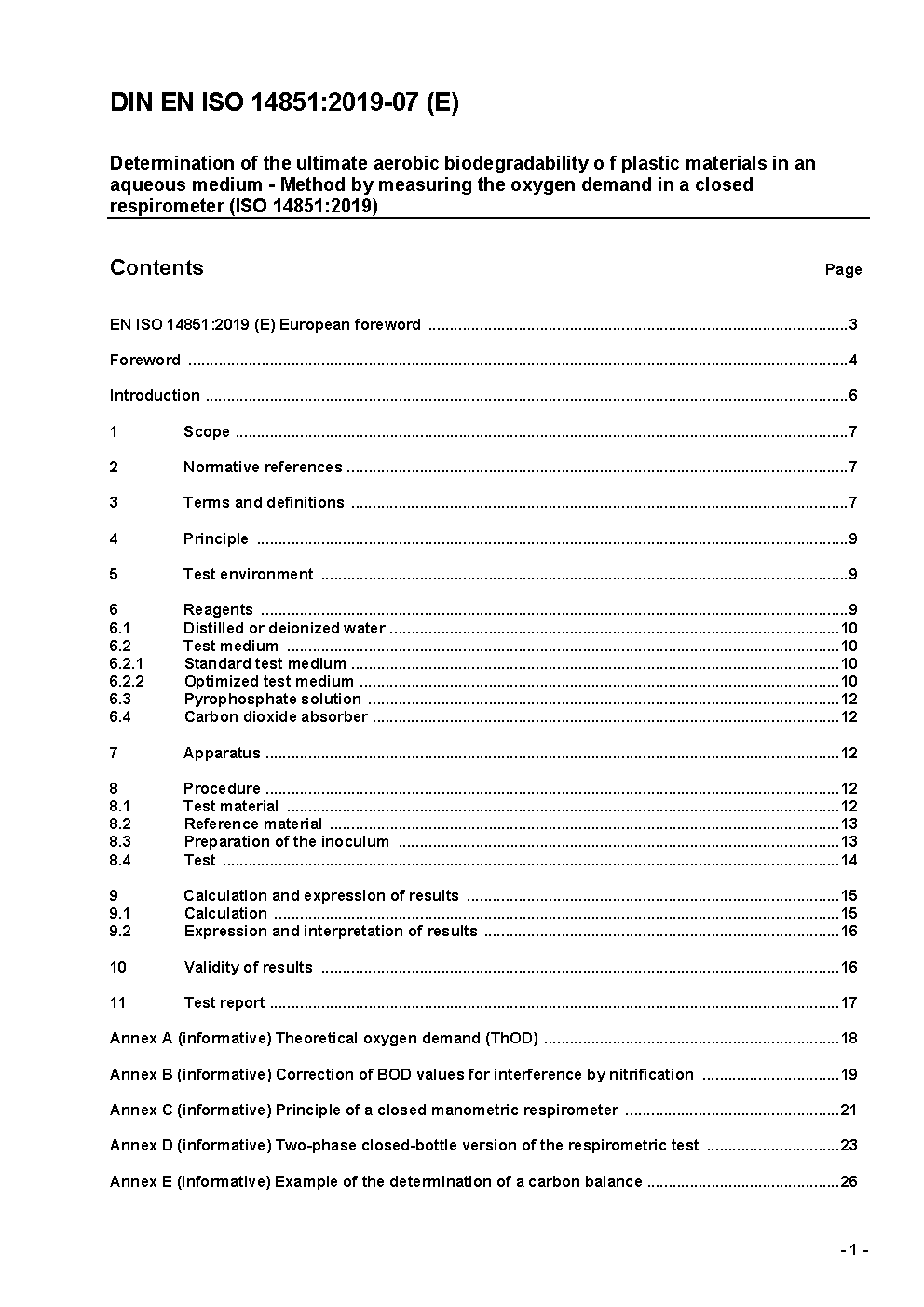 Determination of the ultimate aerobic biodegradability of plastic materials in an aqueous medium - Method by measuring the oxygen demand in a closed respirometer (ISO 14851:1999); German version EN ISO 14851:2004