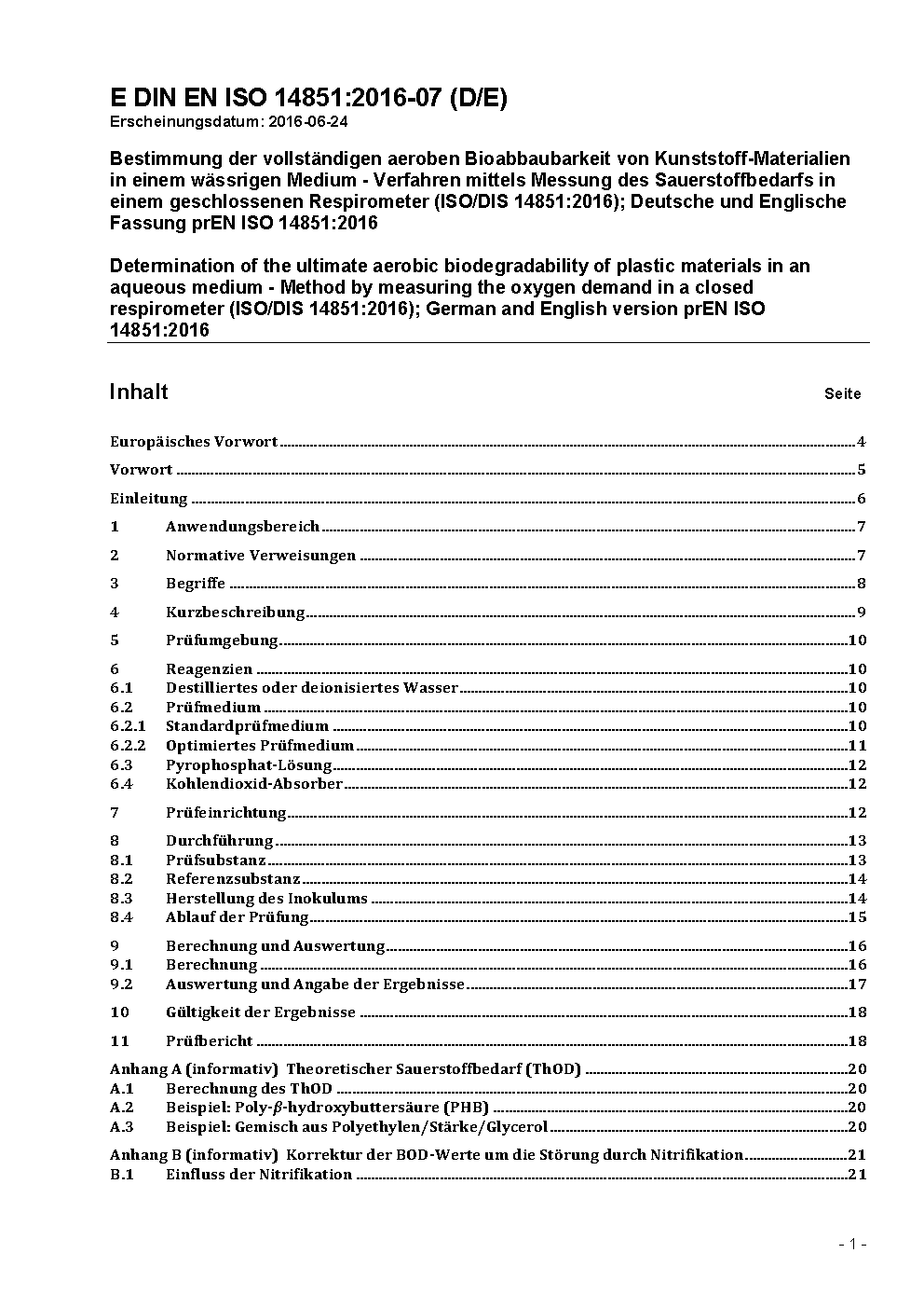 Bestimmung der vollständigen aeroben Bioabbaubarkeit von Kunststoff-Materialien in einem wässrigen Medium - Verfahren mittels Messung des Sauerstoffbedarfs in einem geschlossenen Respirometer (ISO 14851:1999); Deutsche Fassung EN ISO 14851:2004