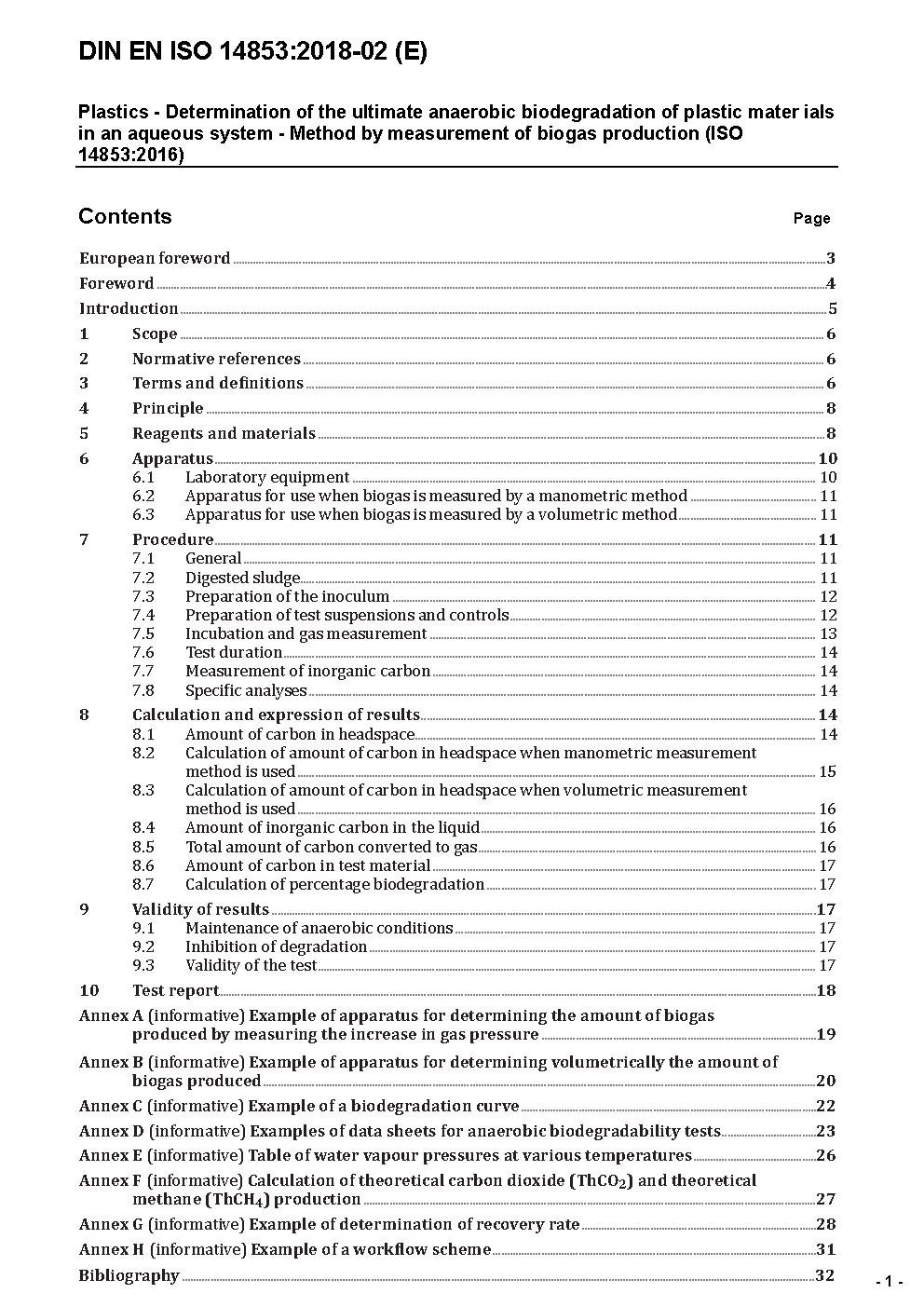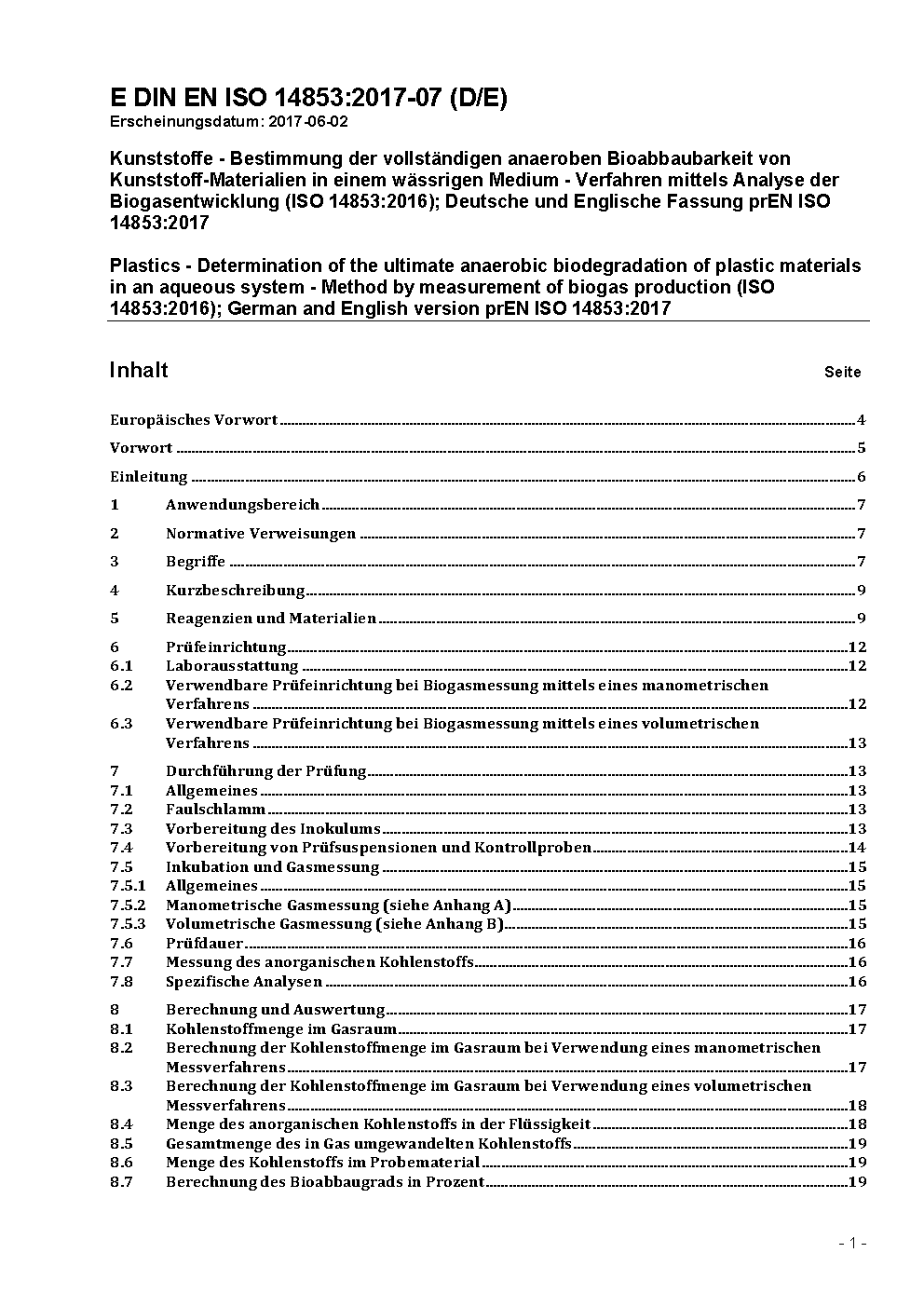 Kunststoffe - Bestimmung des vollständigen anaeroben Bioabbaus von Kunststoff-Materialien in einem wässrigen Medium - Verfahren mittels Analyse der Biogasentwicklung (ISO 14853:2016); Deutsche Fassung EN ISO 14853:2017