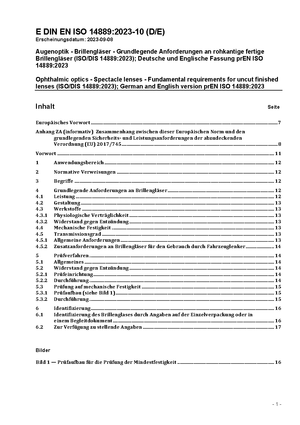 Augenoptik - Brillengläser - Grundlegende Anforderungen an rohkantige fertige Brillengläser (ISO/DIS 14889:2023); Deutsche und Englische Fassung prEN ISO 14889:2023