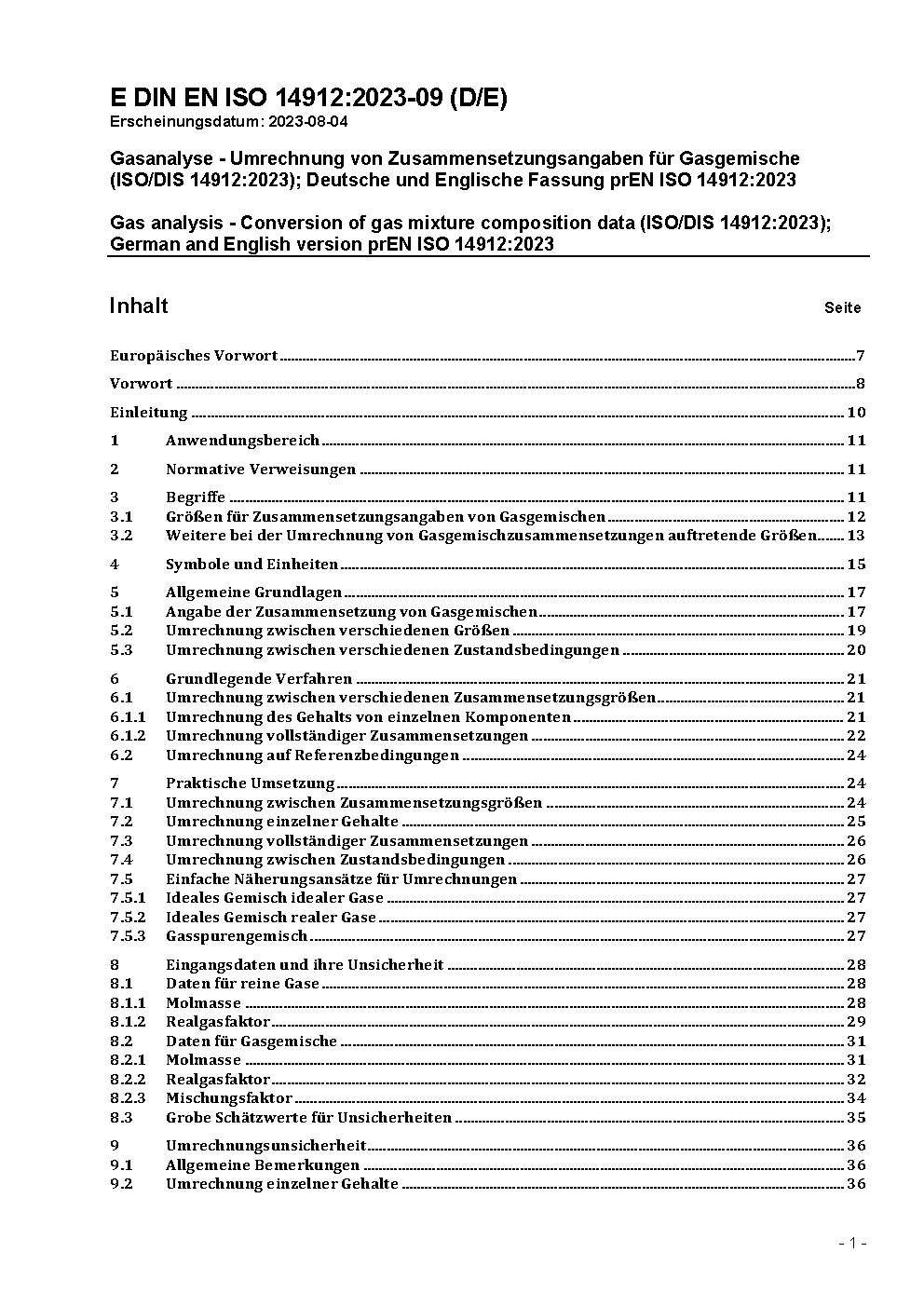 Gasanalyse - Umrechnung von Zusammensetzungsangaben für Gasgemische (ISO/DIS 14912:2023); Deutsche und Englische Fassung prEN ISO 14912:2023