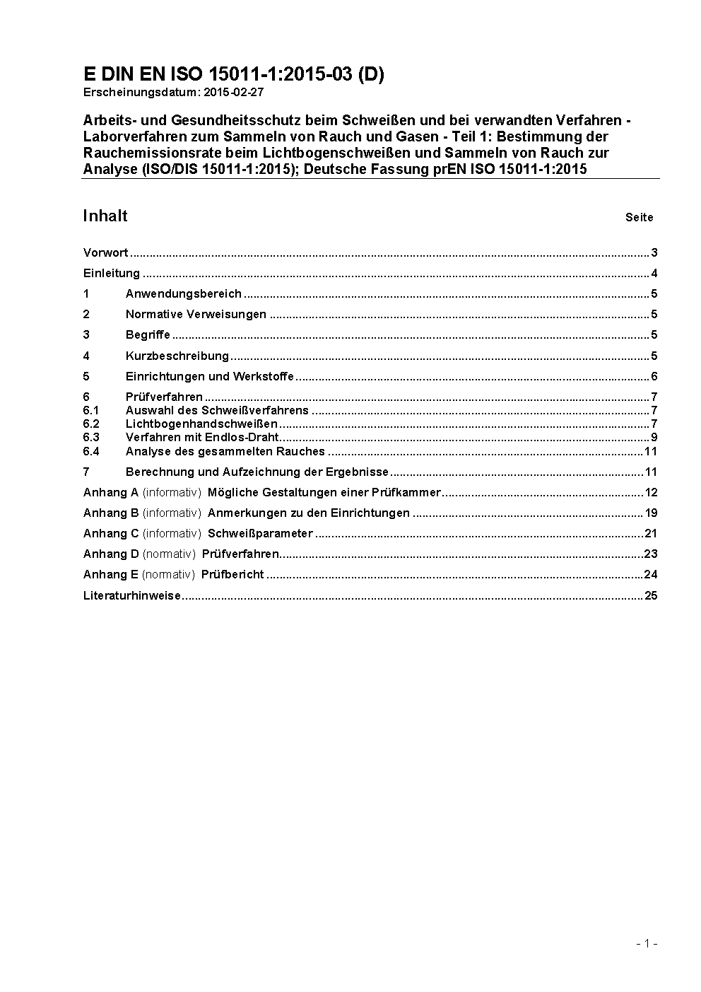 Arbeits- und Gesundheitsschutz beim Schweißen und bei verwandten Verfahren - Laborverfahren zum Sammeln von Rauch und Gasen - Teil 1: Bestimmung der Rauchemissionsrate beim Lichtbogenschweißen und Sammeln von Rauch zur Analyse (ISO 15011-1:2009); Deutsche Fassung EN ISO 15011-1:2009