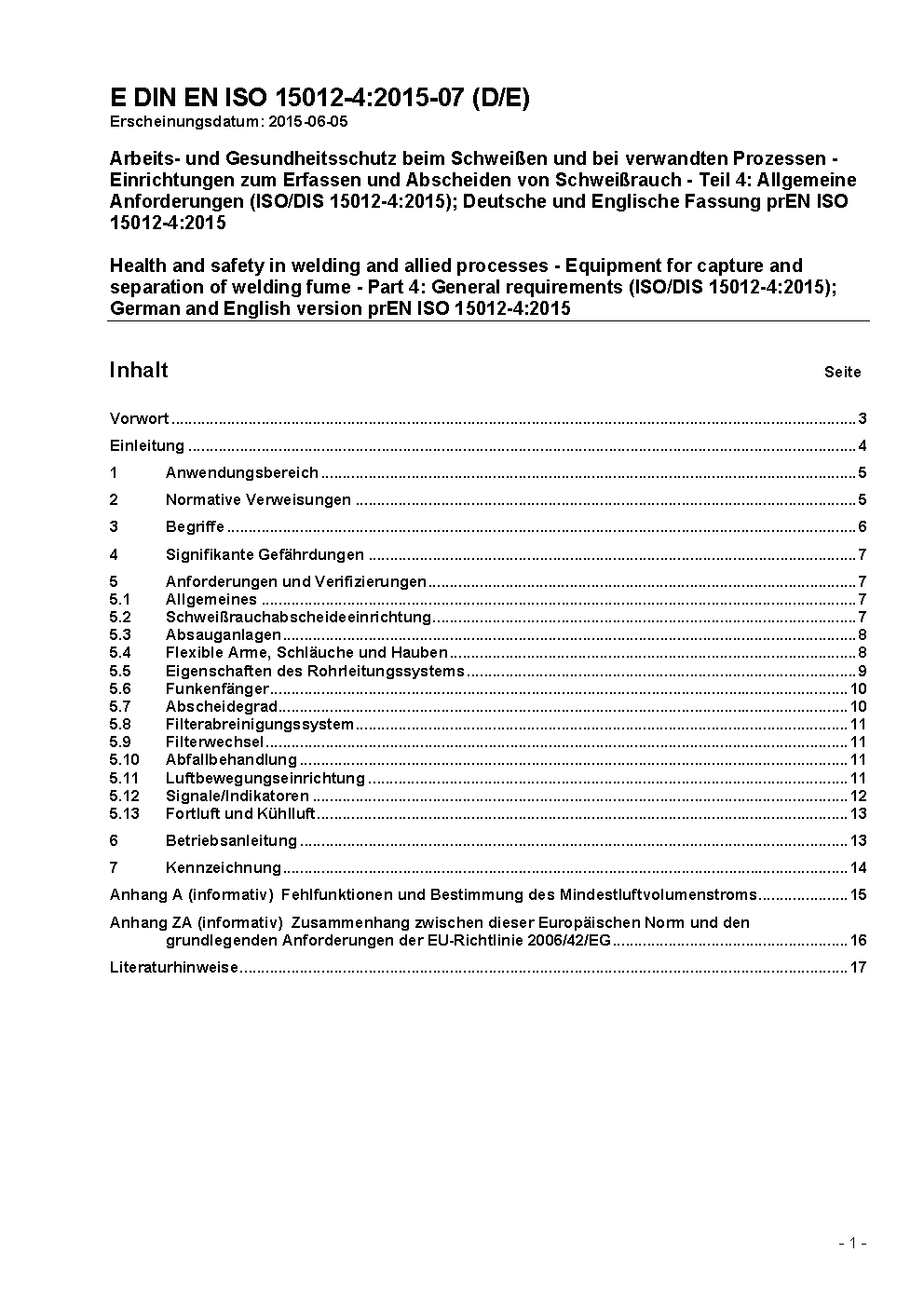 Arbeits- und Gesundheitsschutz beim Schweißen und bei verwandten Prozessen - Einrichtungen zum Erfassen und Abscheiden von Schweißrauch - Teil 4: Allgemeine Anforderungen (ISO/DIS 15012-4:2015); Deutsche und Englische Fassung prEN ISO 15012-4:2015