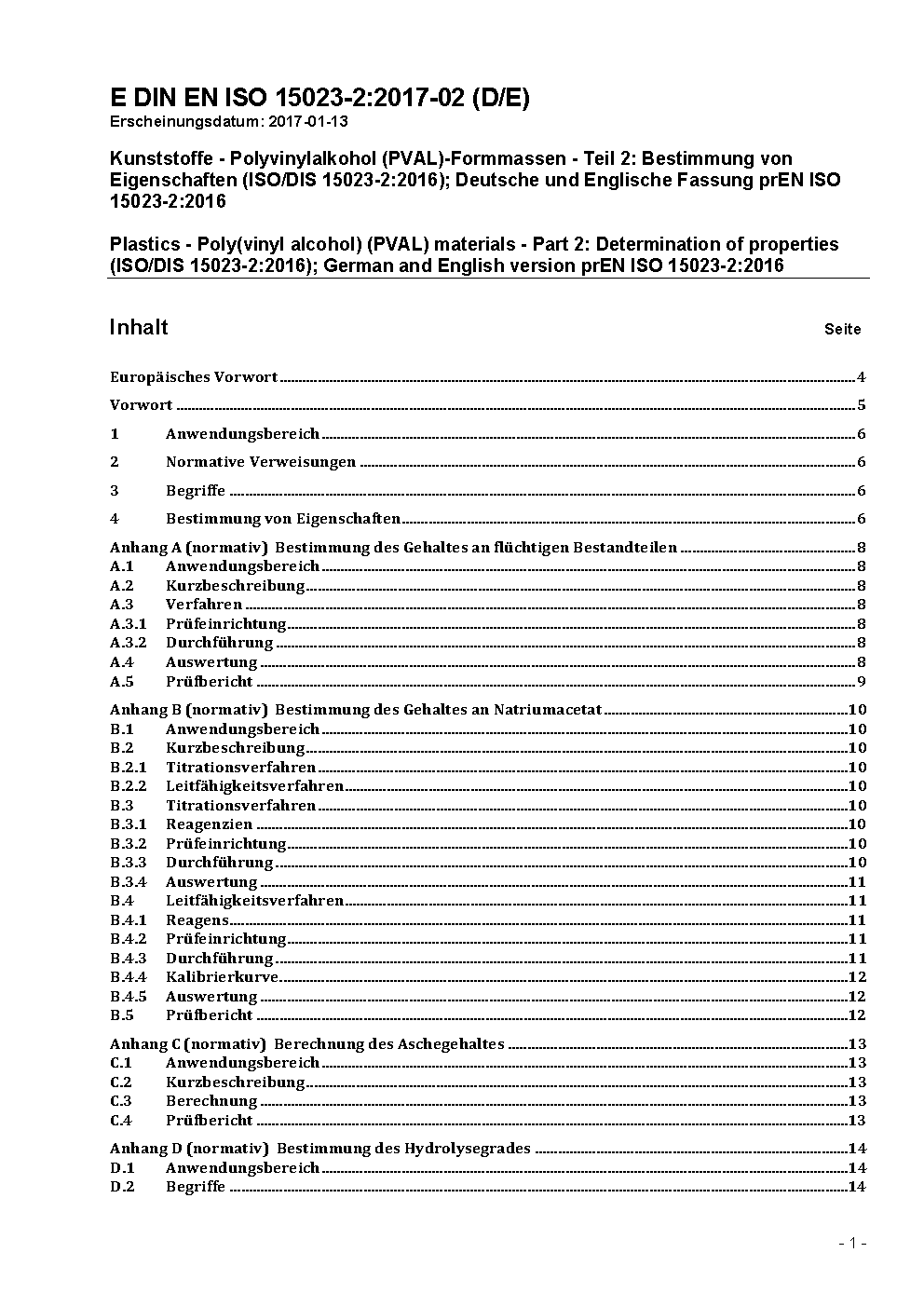 Plastics - Poly(vinyl alcohol) (PVAL) materials - Part 2 : Determination of properties (ISO 15023-2:2003); German version EN ISO 15023-2:2006