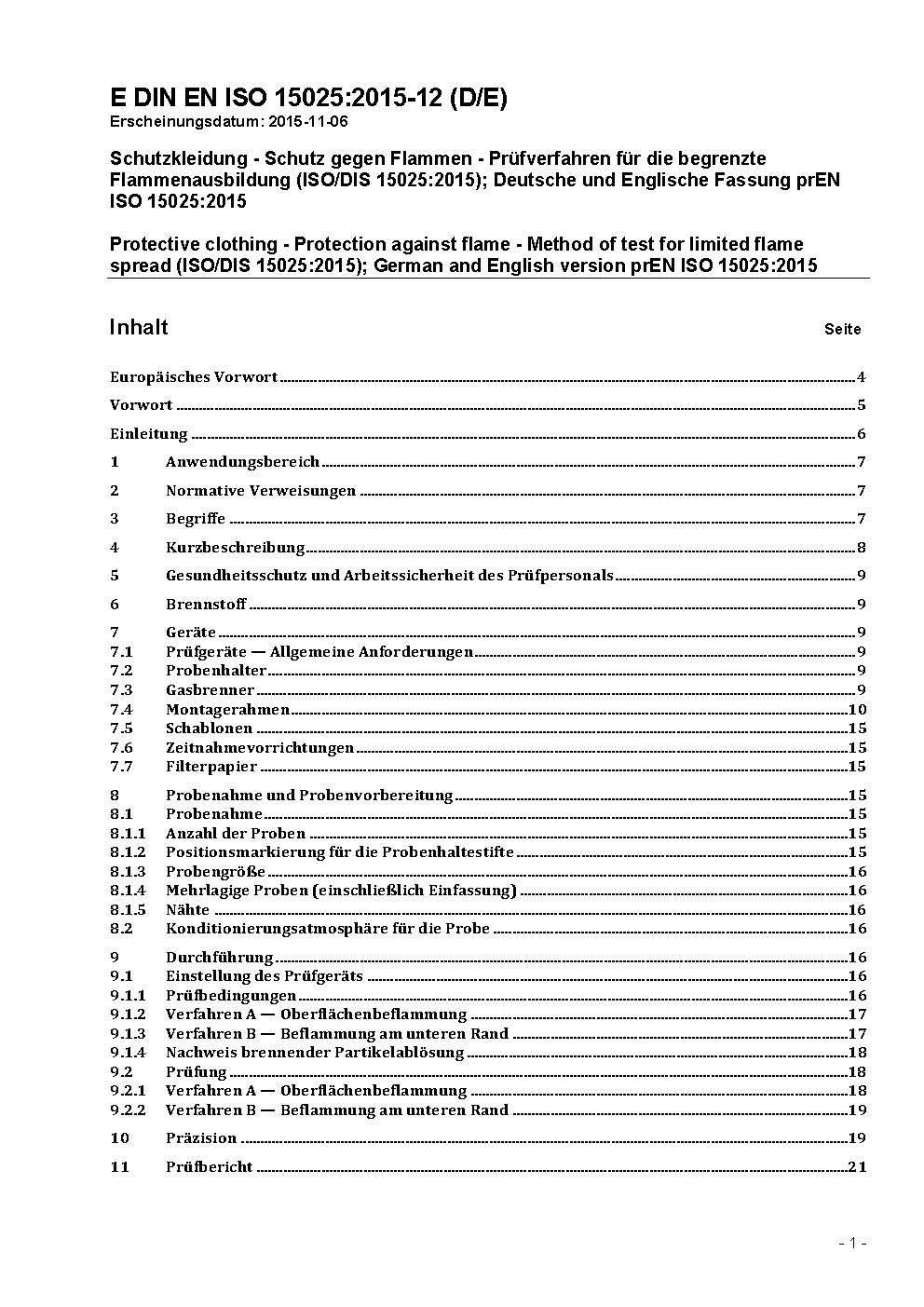 Schutzkleidung - Schutz gegen Hitze und Flammen - Prüfverfahren für die begrenzte Flammenausbildung (ISO 15025:2000); Deutsche Fassung EN ISO 15025:2002