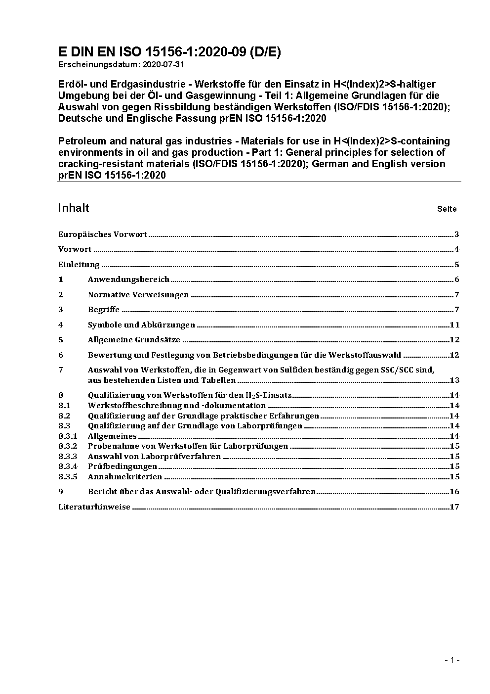 Öl- und Gasindustrie einschließlich kohlenstoffarmer Energieträger - Werkstoffe für den Einsatz in H<(Index)2>S-haltiger Umgebung bei der Öl- und Gasgewinnung - Teil 1: Werkstoffe und Anforderungen an die Werkstoffverarbeitung (ISO/DIS 15156-1:2025); Deutsche und Englische Fassung prEN ISO 15156-1:2025
