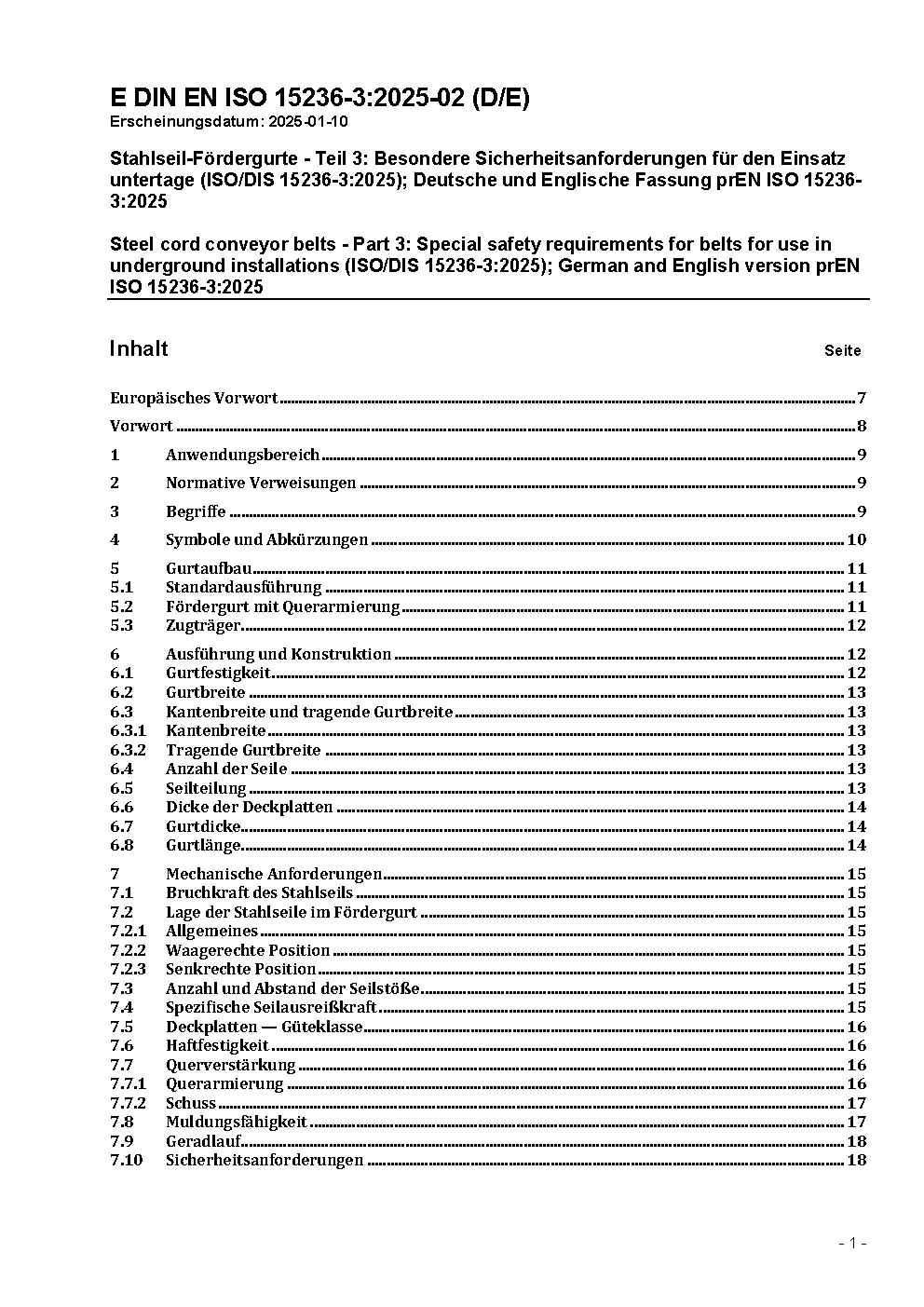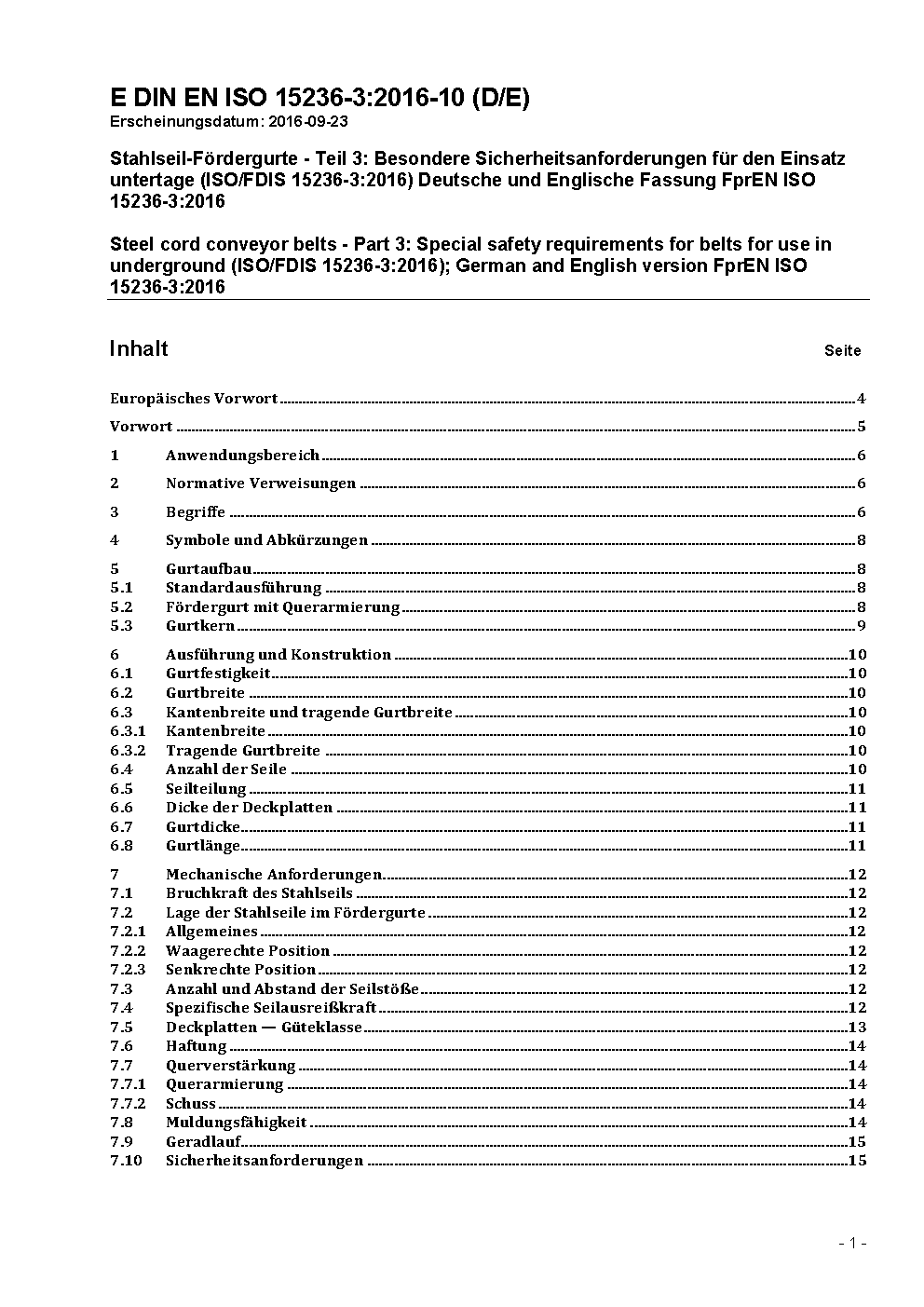 Stahlseil-Fördergurte - Teil 3: Besondere Sicherheitsanforderungen für den Einsatz untertage (ISO/FDIS 15236-3:2016) Deutsche und Englische Fassung FprEN ISO 15236-3:2016