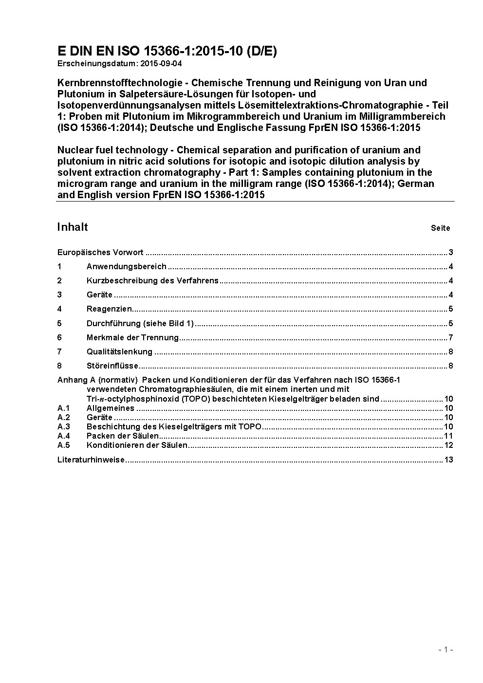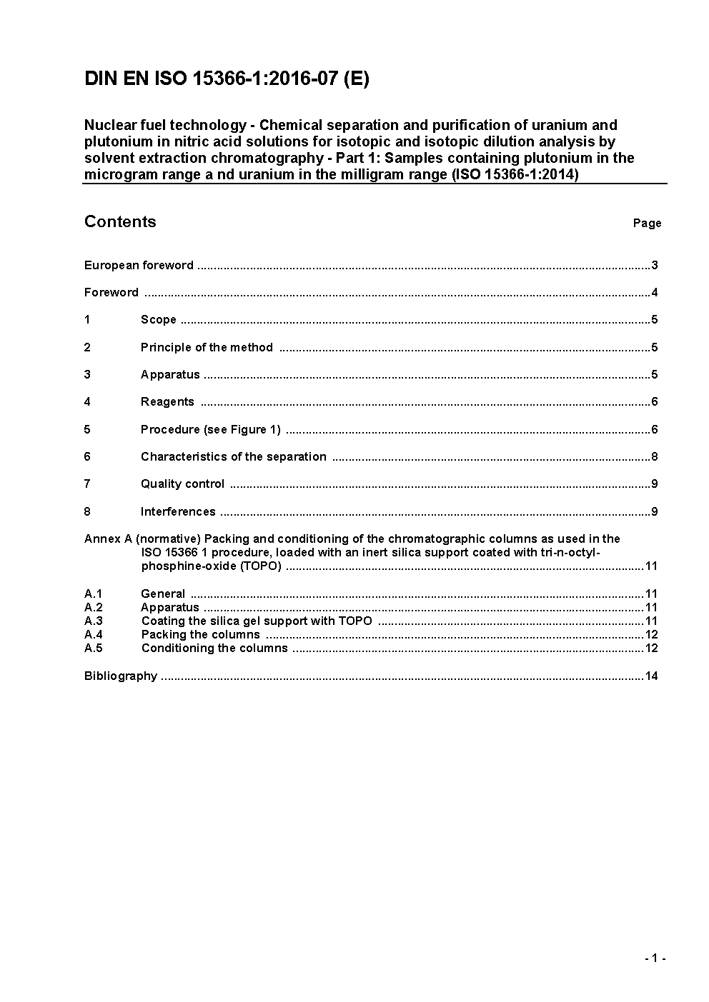 Kernbrennstofftechnologie - Chemische Trennung und Reinigung von Uran und Plutonium in Salpetersäure-Lösungen für Isotopen- und Isotopenverdünnungsanalysen mittels Lösemittelextraktions-Chromatographie - Teil 1: Proben mit Plutonium im Mikrogrammbereich und Uranium im Milligrammbereich (ISO 15366-1:2014); Deutsche Fassung EN ISO 15366-1:2016