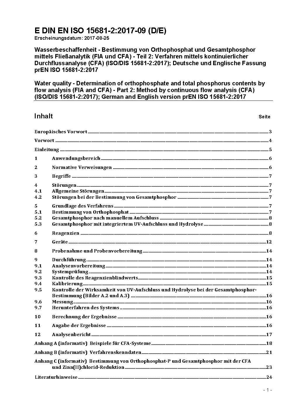 Wasserbeschaffenheit - Bestimmung von Orthophosphat und Gesamtphosphor mittels Fließanalytik (FIA und CFA) - Teil 2: Verfahren mittels kontinuierlicher Durchflussanalyse (CFA) (ISO 15681-2:2018); Deutsche Fassung EN ISO 15681-2:2018