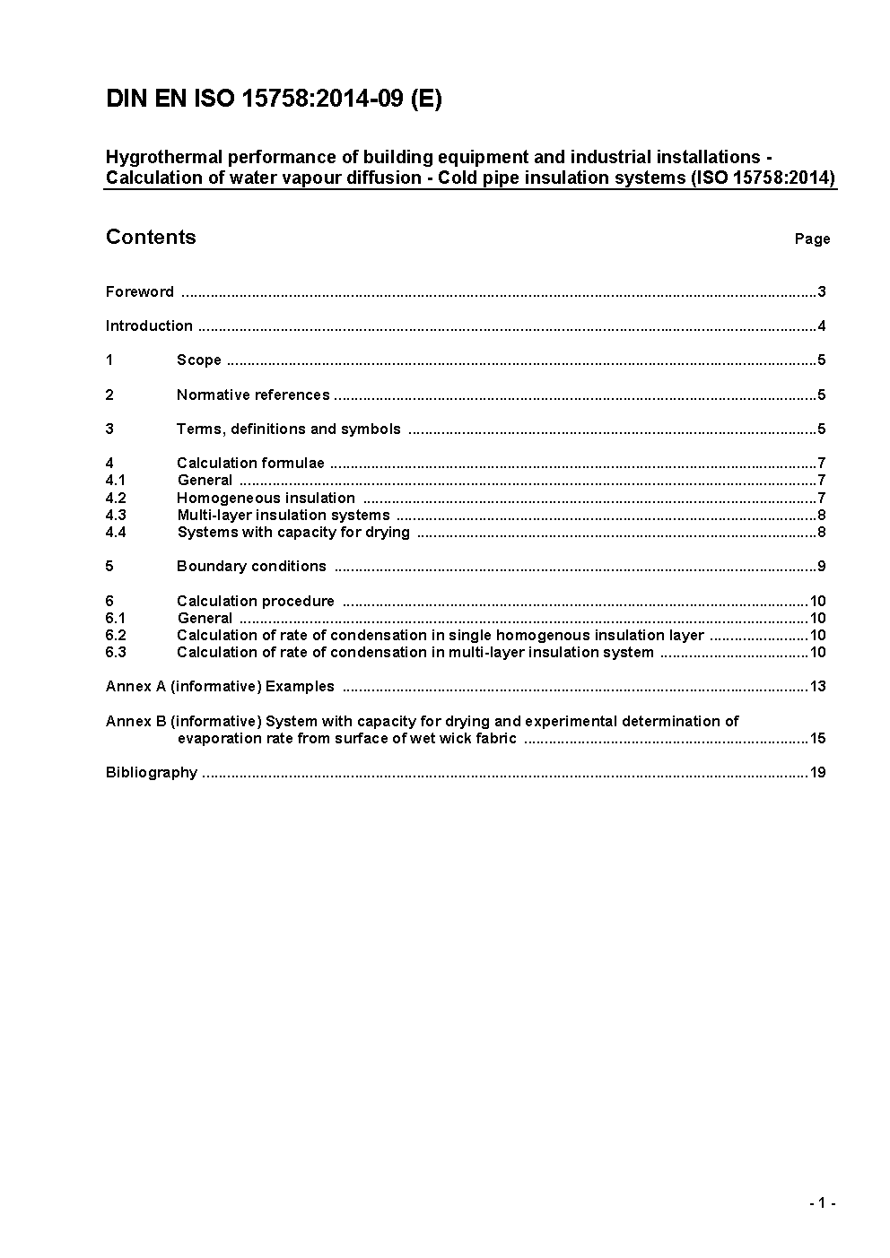 Wärme- und feuchtetechnisches Verhalten von haus- und betriebstechnischen Anlagen - Berechnung der Wasserdampfdiffusion - Dämmung von Kälteleitungen (ISO 15758:2014); Deutsche Fassung EN ISO 15758:2014