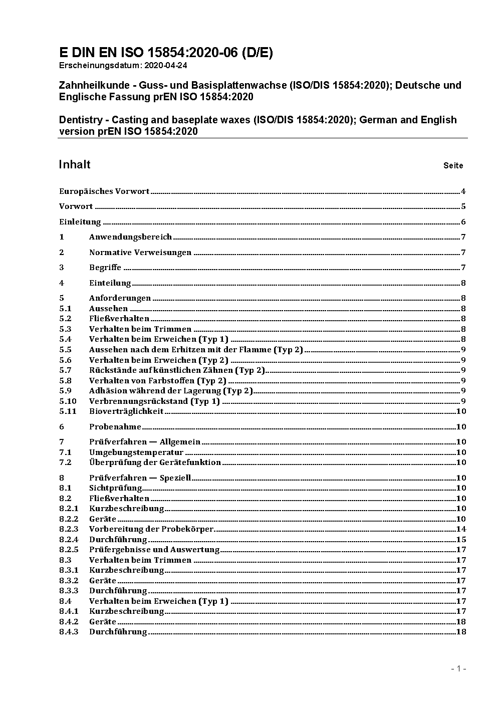 Dentistry - Casting and baseplate waxes (ISO 15854:2023); German version EN ISO 15854:2023