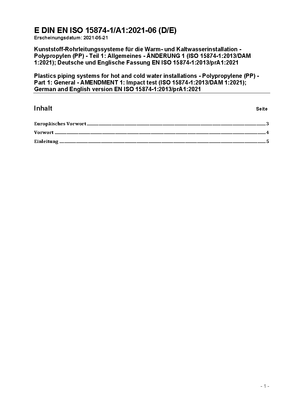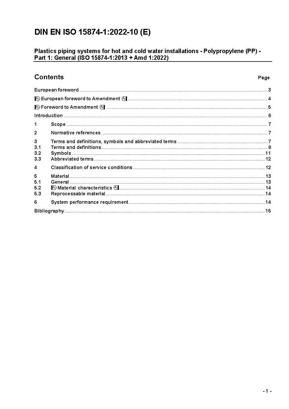 Plastics piping systems for hot and cold water installations - Polypropylene (PP) - Part 1: General (ISO 15874-1:2013); German and English version EN ISO 15874-1:2013
