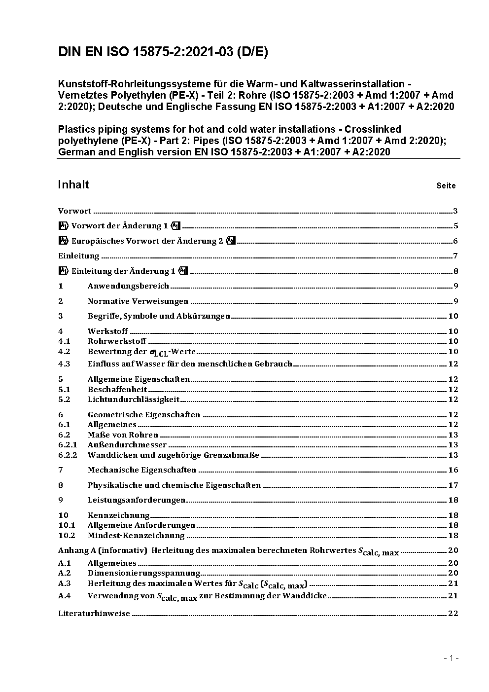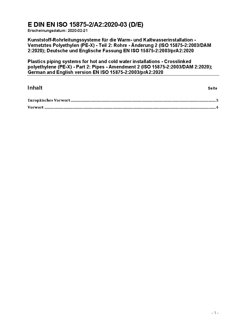 Kunststoff-Rohrleitungssysteme für die Warm- und Kaltwasserinstallation - Vernetztes Polyethylen (PE-X) - Teil 2: Rohre - Änderung 1 (ISO 15875-2:2003/Amd 1:2007); Deutsche Fassung EN ISO 15875-2:2003/A1:2007