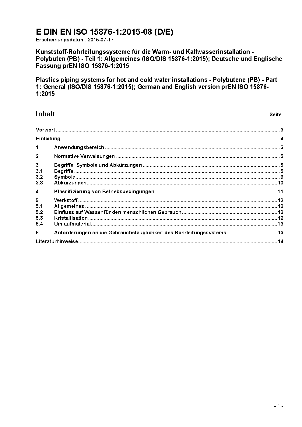Plastics piping systems for hot and cold water installations - Polybutylene (PB) - Part 1: General (ISO 15876-1:2003); German version EN ISO 15876-1:2003
