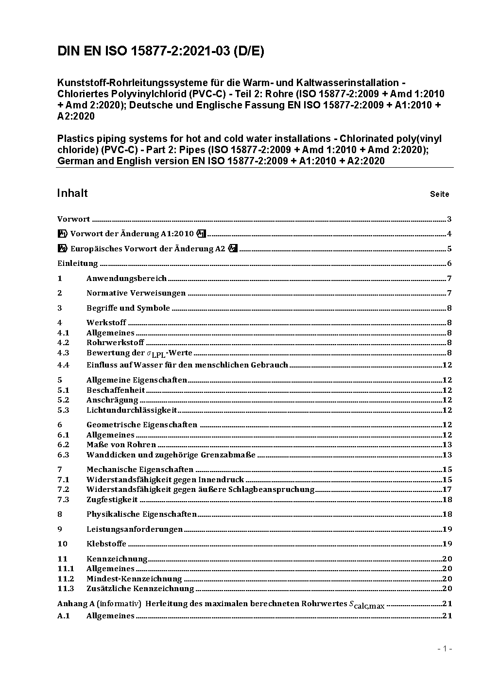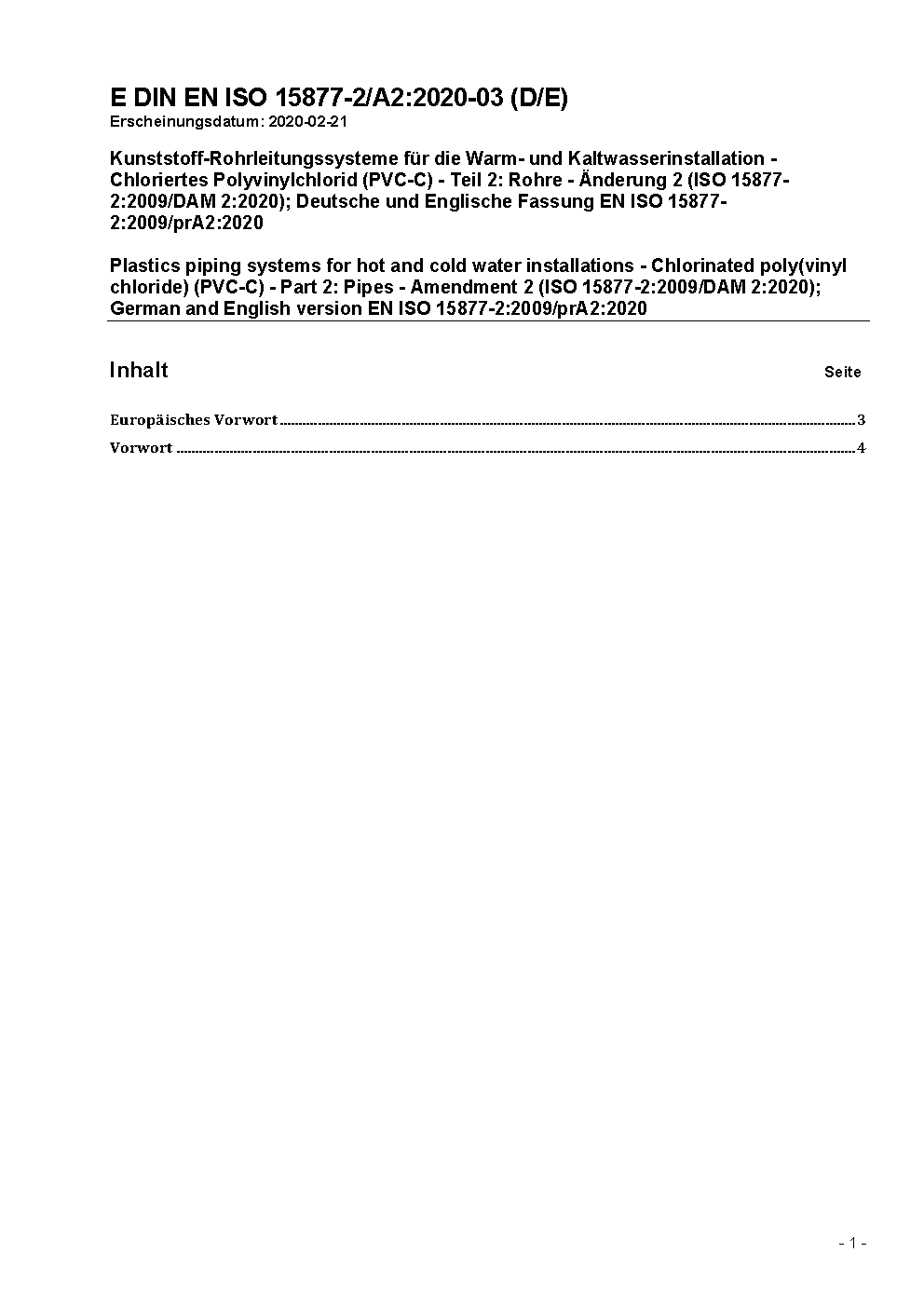 Kunststoff-Rohrleitungssysteme für die Warm- und Kaltwasserinstallation - Chloriertes Polyvinylchlorid (PVC-C) - Teil 2: Rohre (ISO 15877-2:2009 + Amd 1:2010 + Amd 2:2020); Deutsche und Englische Fassung EN ISO 15877-2:2009 + A1:2010 + A2:2020 / Achtung: Diese Norm ist Bestandteil des DVGW Regelwerks.