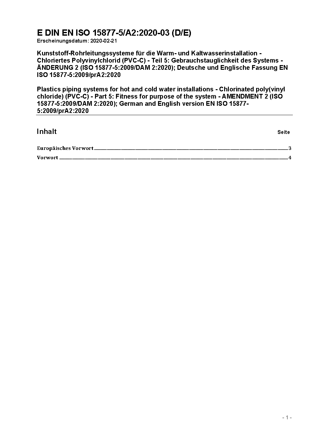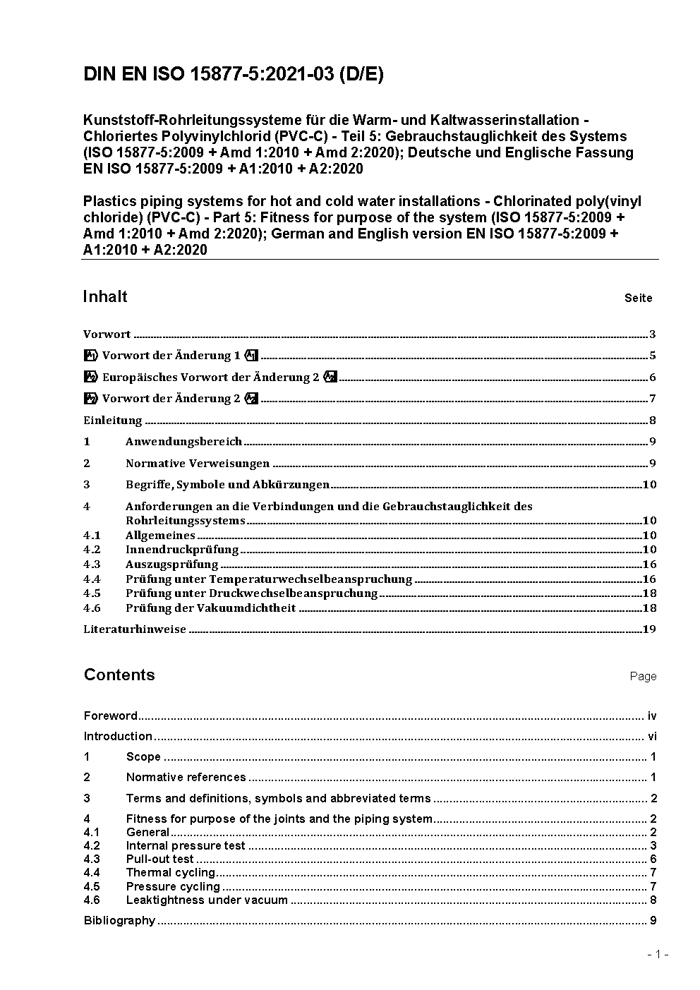 Kunststoff-Rohrleitungssysteme für die Warm- und Kaltwasserinstallation - Chloriertes Polyvinylchlorid (PVC-C) - Teil 5: Gebrauchstauglichkeit des Systems (ISO 15877-5:2009 + AMD 1:2010); Deutsche Fassung EN ISO 15877-5:2009 + A1:2010