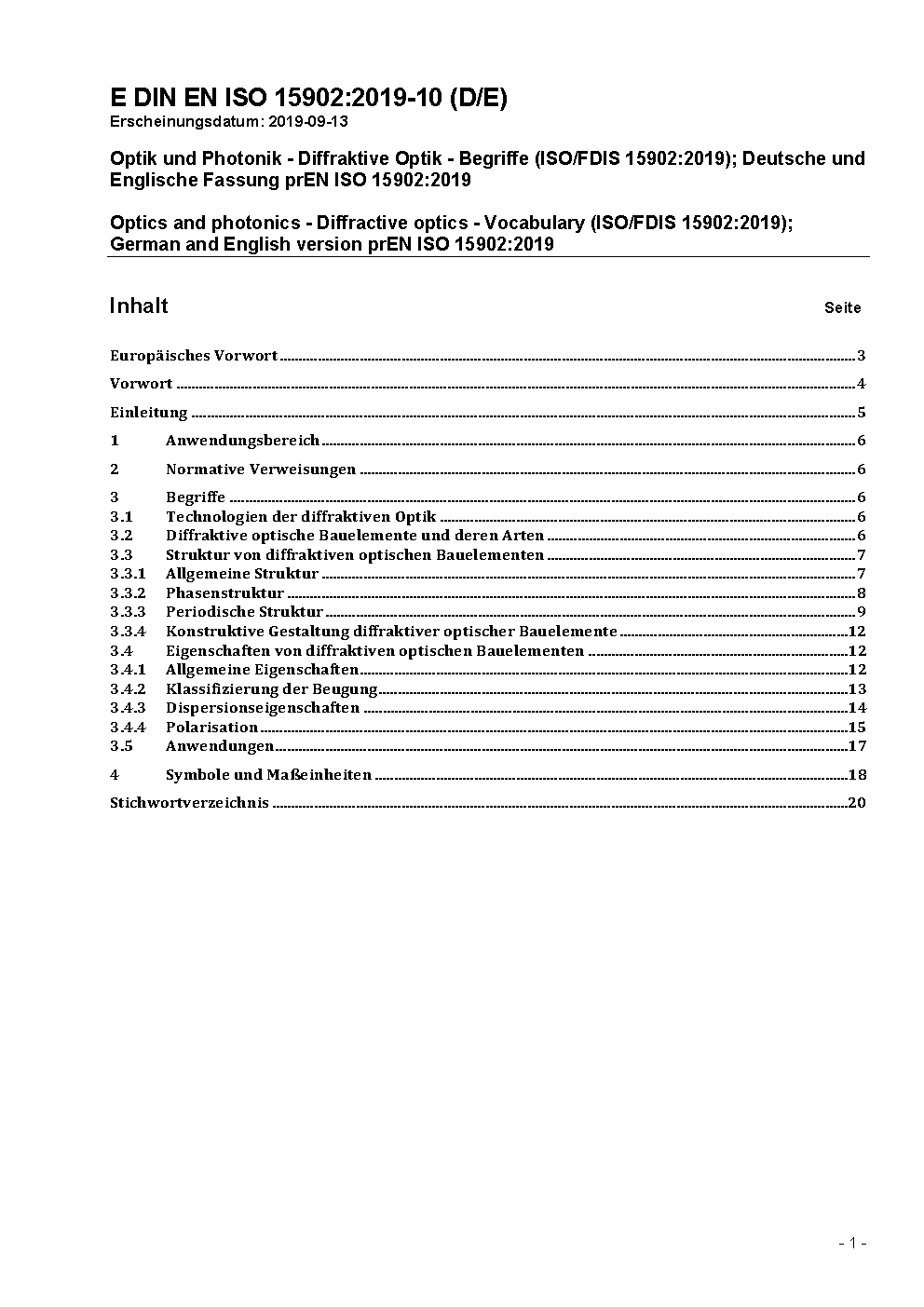 Optik und Photonik - Diffraktive Optik - Begriffe (ISO/FDIS 15902:2019); Deutsche und Englische Fassung prEN ISO 15902:2019
