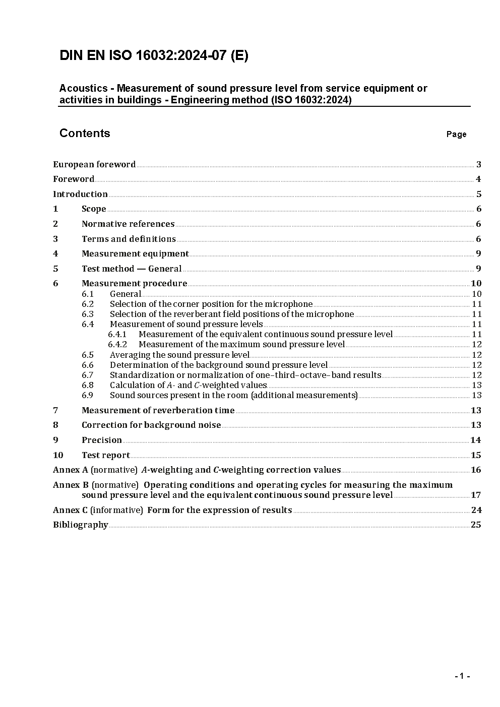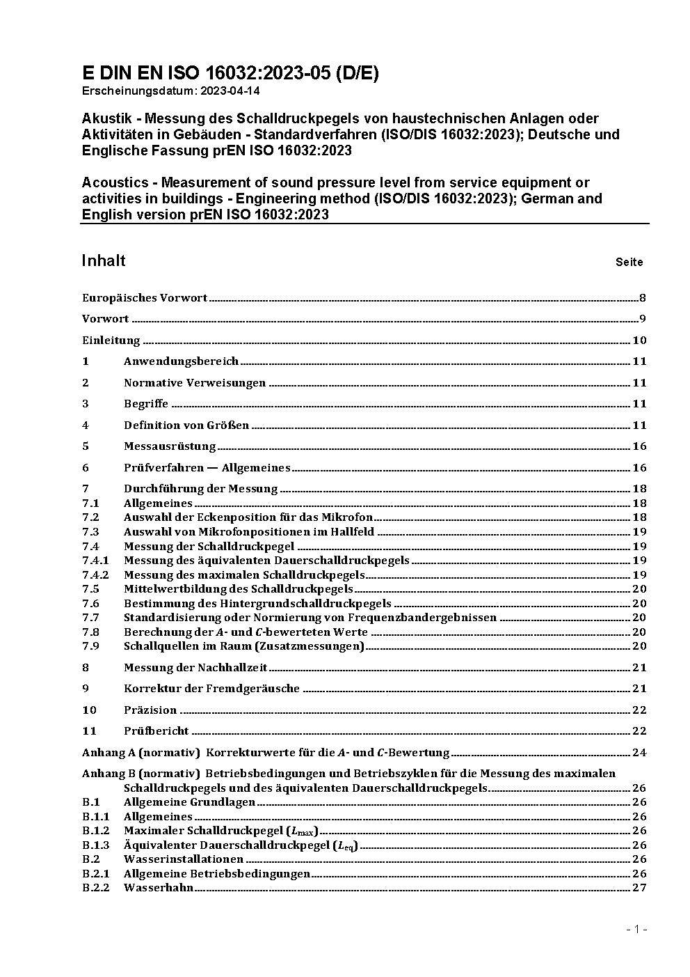Akustik - Messung des Schalldruckpegels von haustechnischen Anlagen oder Aktivitäten in Gebäuden - Standardverfahren (ISO/DIS 16032:2023); Deutsche und Englische Fassung prEN ISO 16032:2023