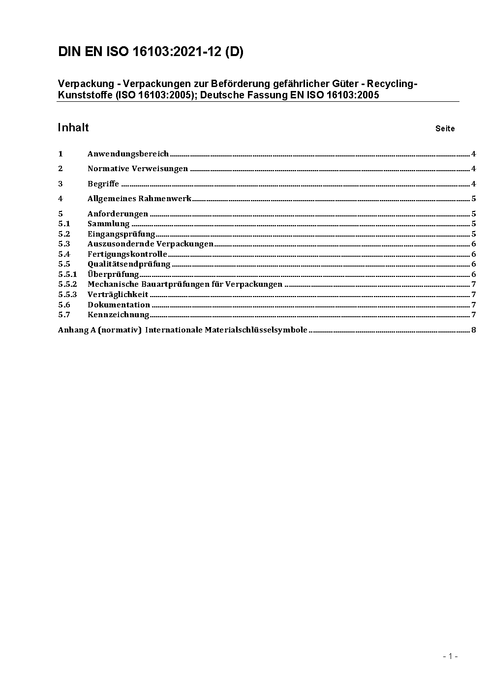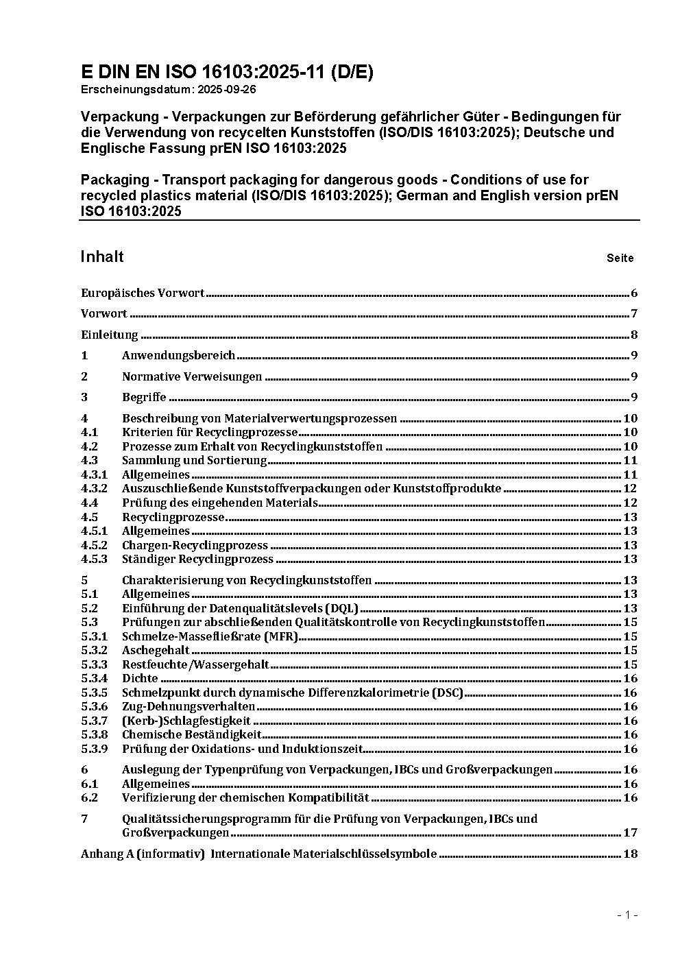 Verpackung - Verpackungen zur Beförderung gefährlicher Güter - Bedingungen für die Verwendung von recycelten Kunststoffen (ISO/DIS 16103:2025); Deutsche und Englische Fassung prEN ISO 16103:2025