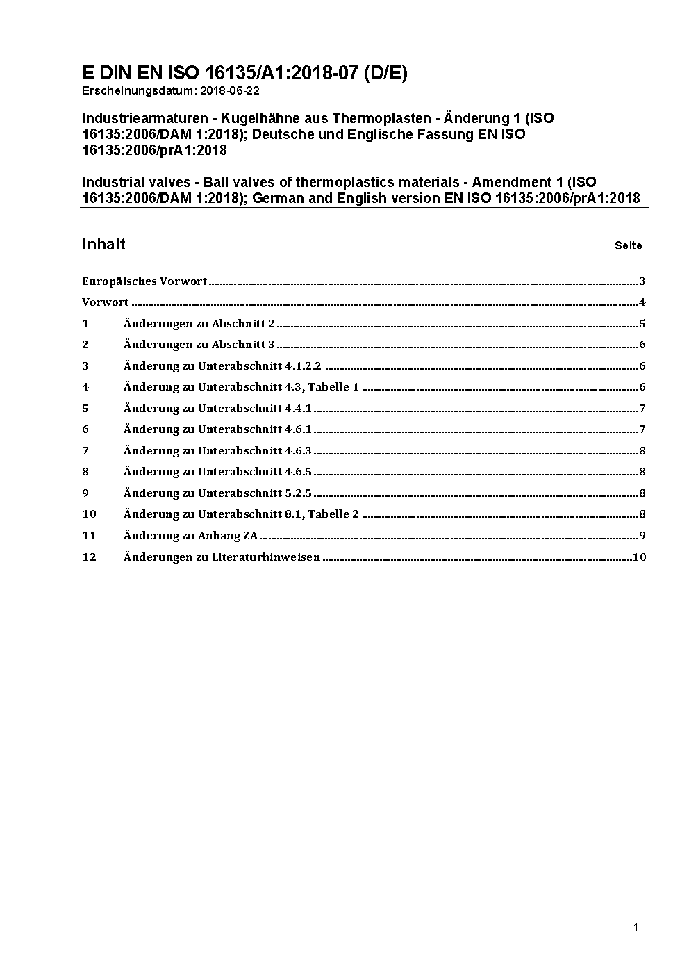 Industriearmaturen - Kugelhähne aus Thermoplasten - Änderung 1 (ISO 16135:2006/DAM 1:2018); Deutsche und Englische Fassung EN ISO 16135:2006/prA1:2018