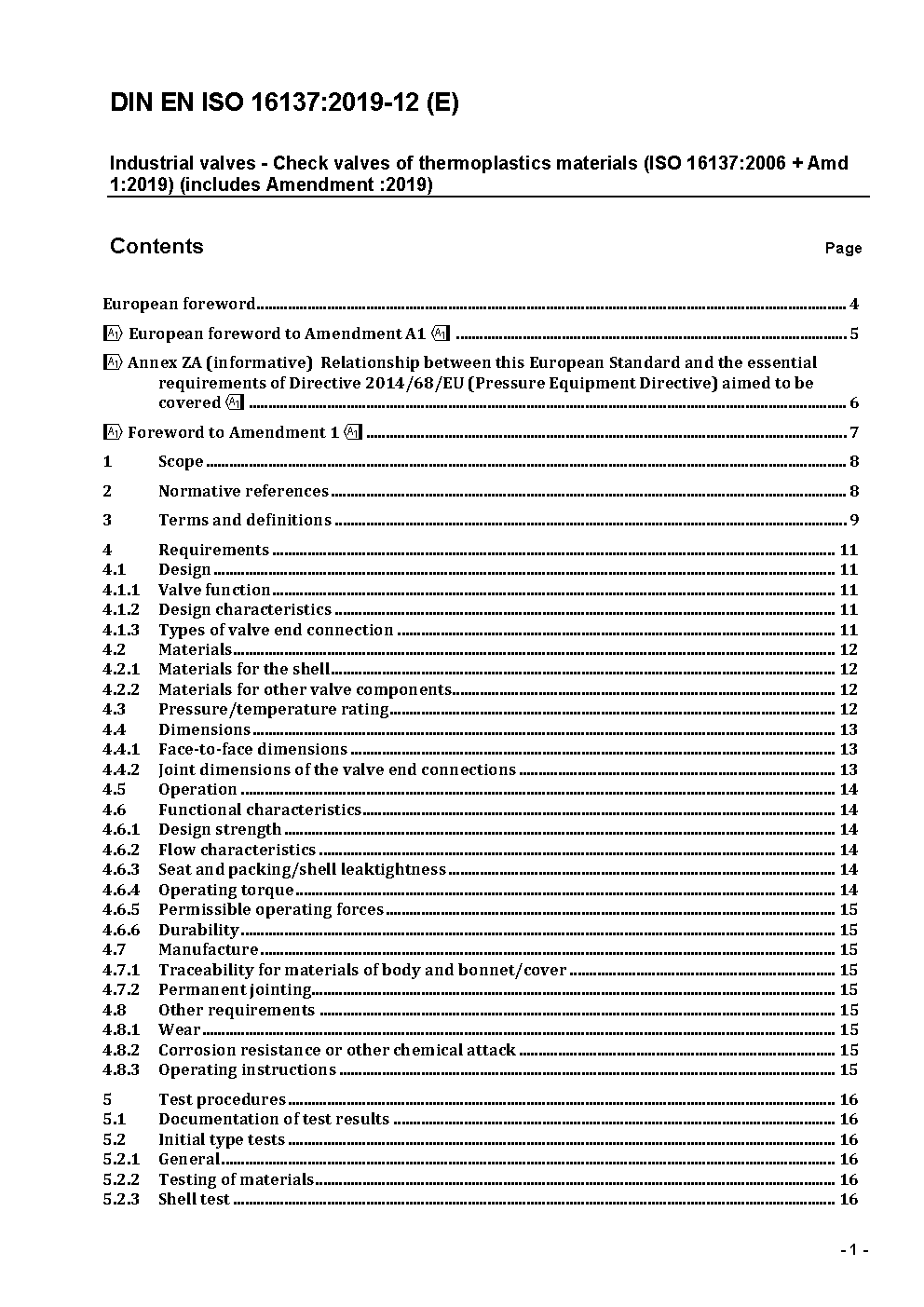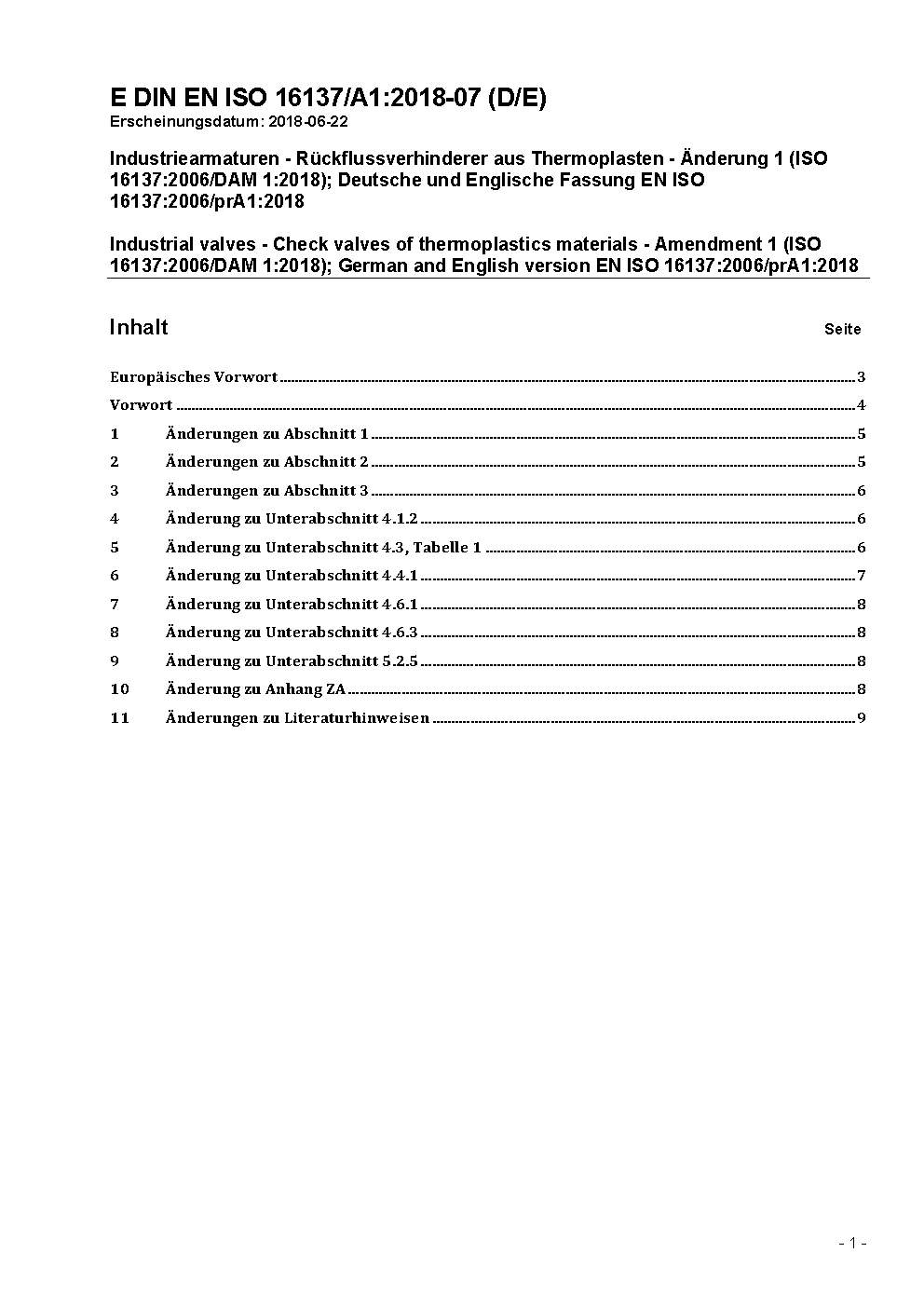 Industriearmaturen - Rückflussverhinderer aus Thermoplasten - Änderung 1 (ISO 16137:2006/DAM 1:2018); Deutsche und Englische Fassung EN ISO 16137:2006/prA1:2018