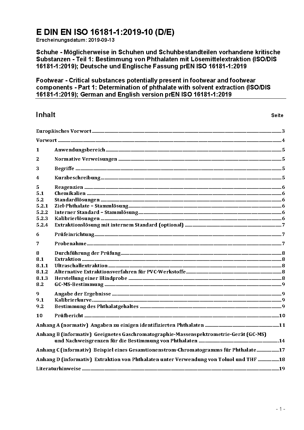 Schuhe - Möglicherweise in Schuhen und Schuhbestandteilen vorhandene kritische Substanzen - Teil 1: Bestimmung von Phthalaten mit Lösemittelextraktion (ISO 16181-1:2021); Deutsche Fassung EN ISO 16181-1:2021
