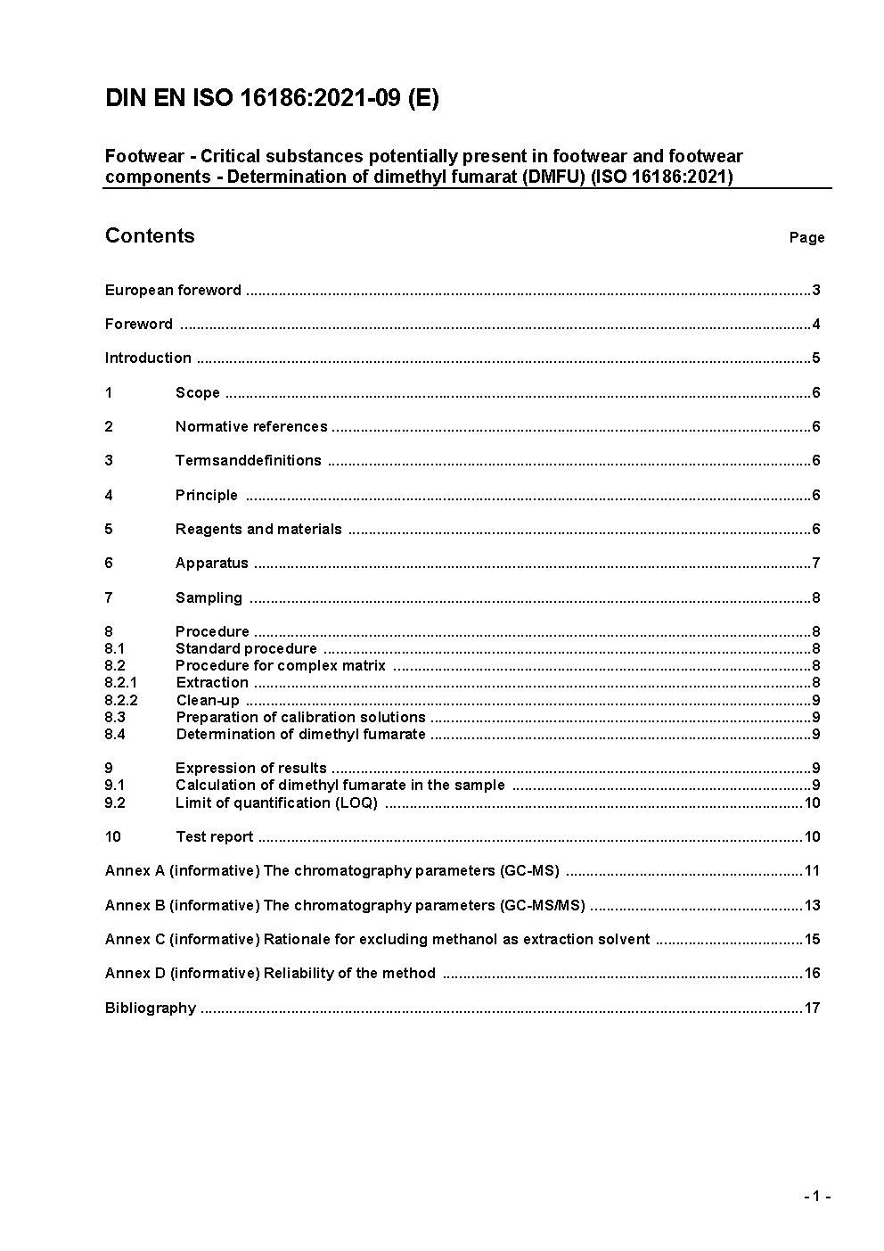 Schuhe - Möglicherweise in Schuhen und Schuhbestandteilen vorhandene kritische Substanzen - Bestimmung von Dimethylfumarat (DMFU) in Schuhwerkstoffen (ISO/DIS 16186:2020); Deutsche und Englische Fassung prEN ISO 16186:2020