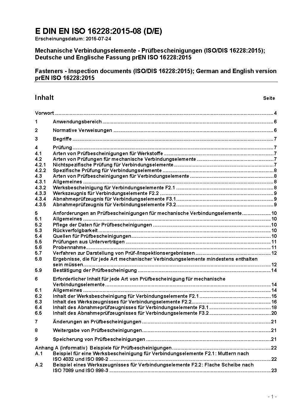 Fasteners - Inspection documents (ISO/DIS 16228:2015); German and English version prEN ISO 16228:2015