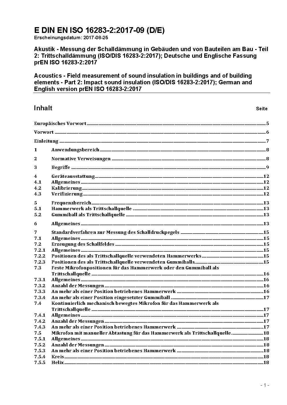Akustik - Messung der Schalldämmung in Gebäuden und von Bauteilen am Bau - Teil 2: Trittschalldämmung (ISO/DIS 16283-2:2017); Deutsche und Englische Fassung prEN ISO 16283-2:2017