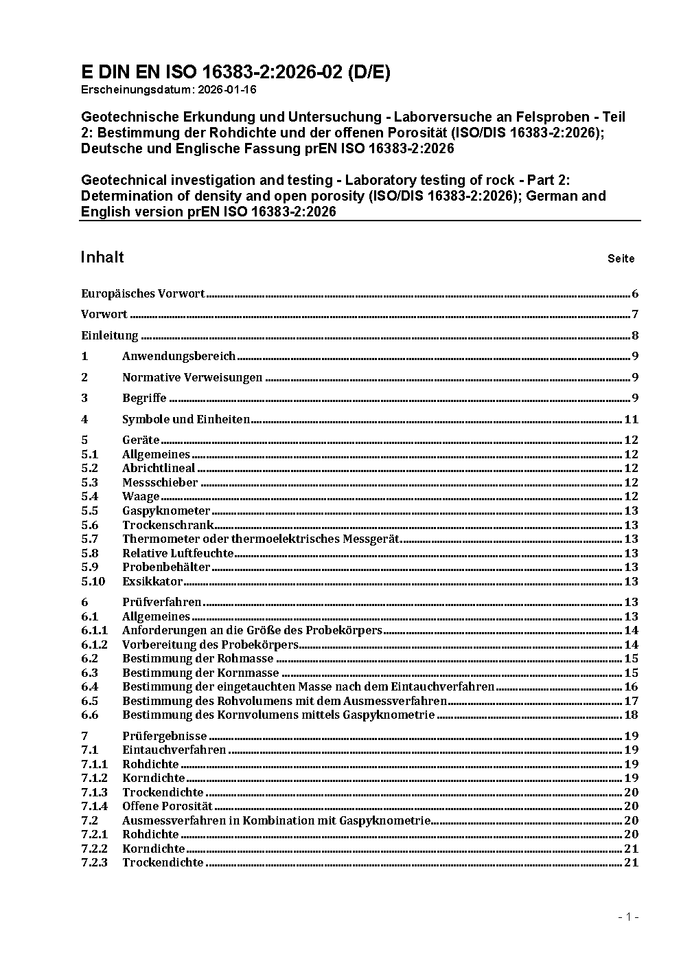 Geotechnische Erkundung und Untersuchung - Laborversuche an Felsproben - Teil 2: Bestimmung der Rohdichte und der offenen Porosität (ISO/DIS 16383-2:2026); Deutsche und Englische Fassung prEN ISO 16383-2:2026