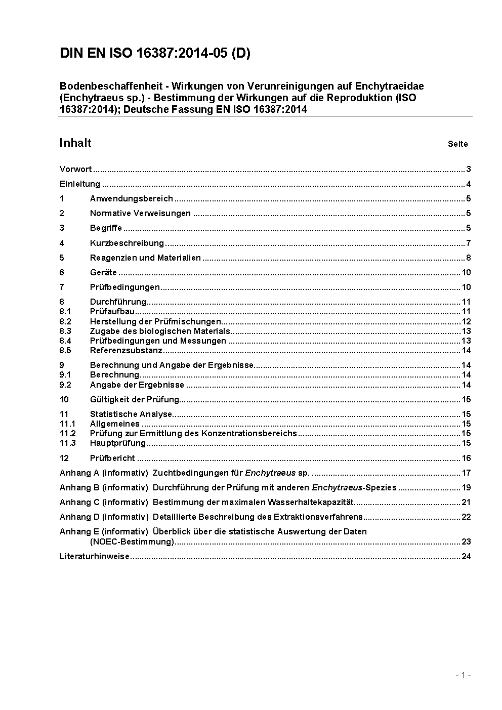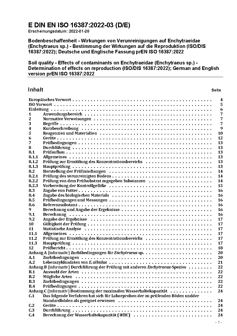 Soil quality - Effects of pollutants on Enchytraeidae (Enchytraeus sp.) - Determination of effects on reproduction (ISO/DIS 16387:2012); German version prEN ISO 16387:2012