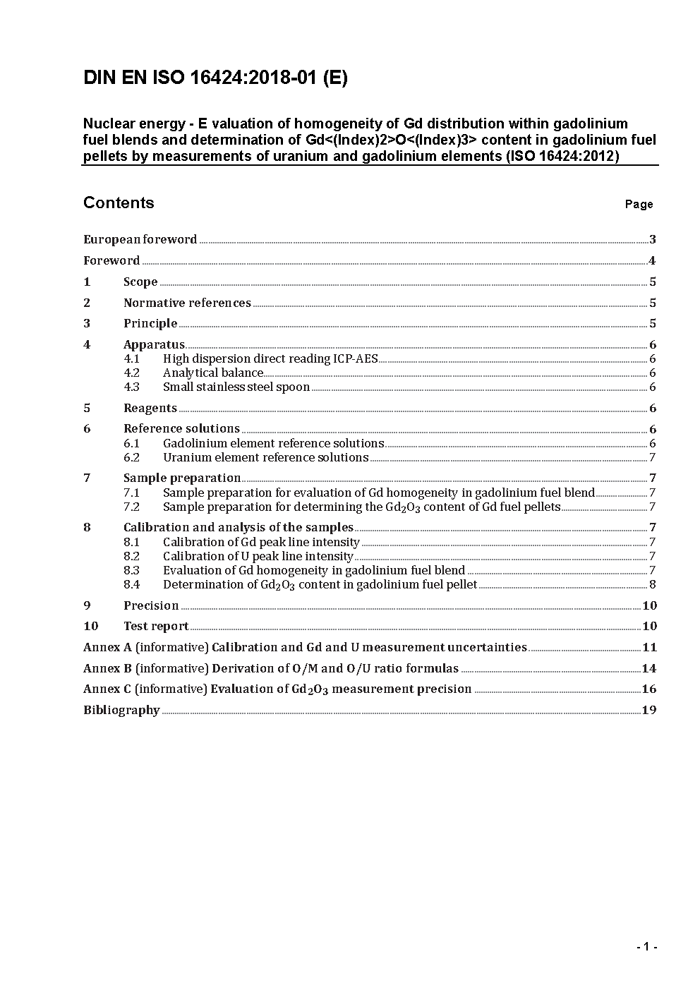 Nuclear energy - Evaluation of homogeneity of Gd distribution within gadolinium fuel blends and determination of Gd<(Index)2>O<(Index)3> content in gadolinium fuel pellets by measurements of uranium and gadolinium elements (ISO 16424:2012); German and English version prEN ISO 16424:2017