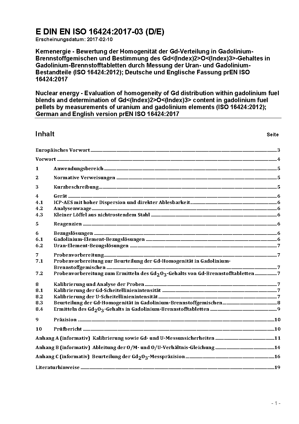 Kernenergie - Bewertung der Homogenität der Gd-Verteilung in Gadolinium-Brennstoffgemischen und Bestimmung des Gd<(Index)2>O<(Index)3>-Gehaltes in Gadolinium-Brennstofftabletten durch Messung der Uran- und Gadolinium-Bestandteile (ISO 16424:2012); Deutsche und Englische Fassung prEN ISO 16424:2017