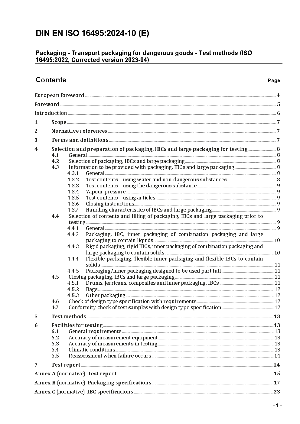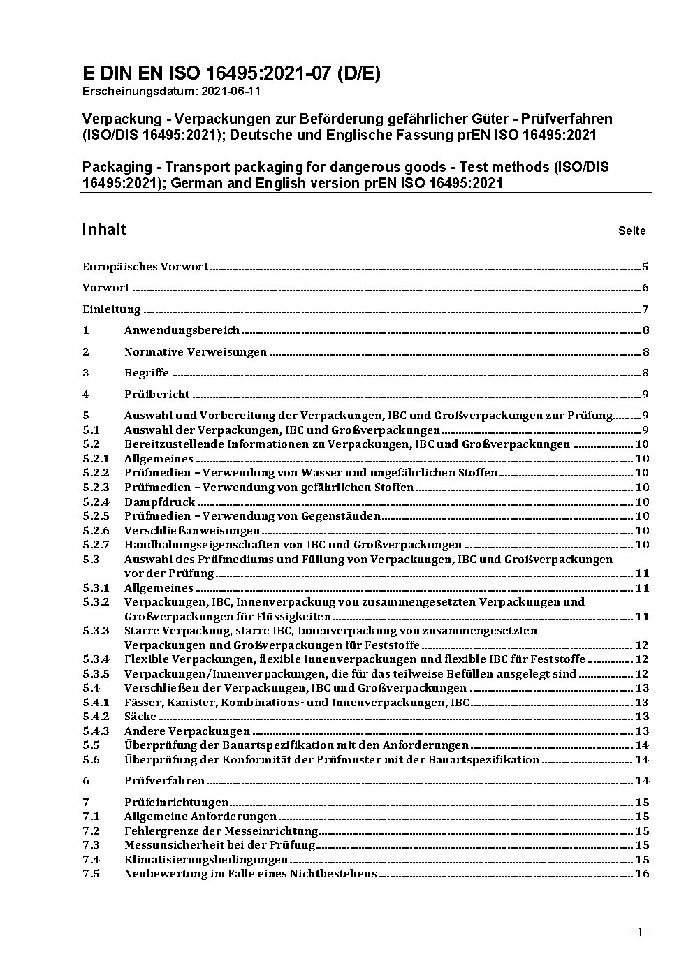 Verpackung - Verpackungen zur Beförderung gefährlicher Güter - Prüfverfahren (ISO/DIS 16495:2012); Deutsche Fassung prEN ISO 16495:2012