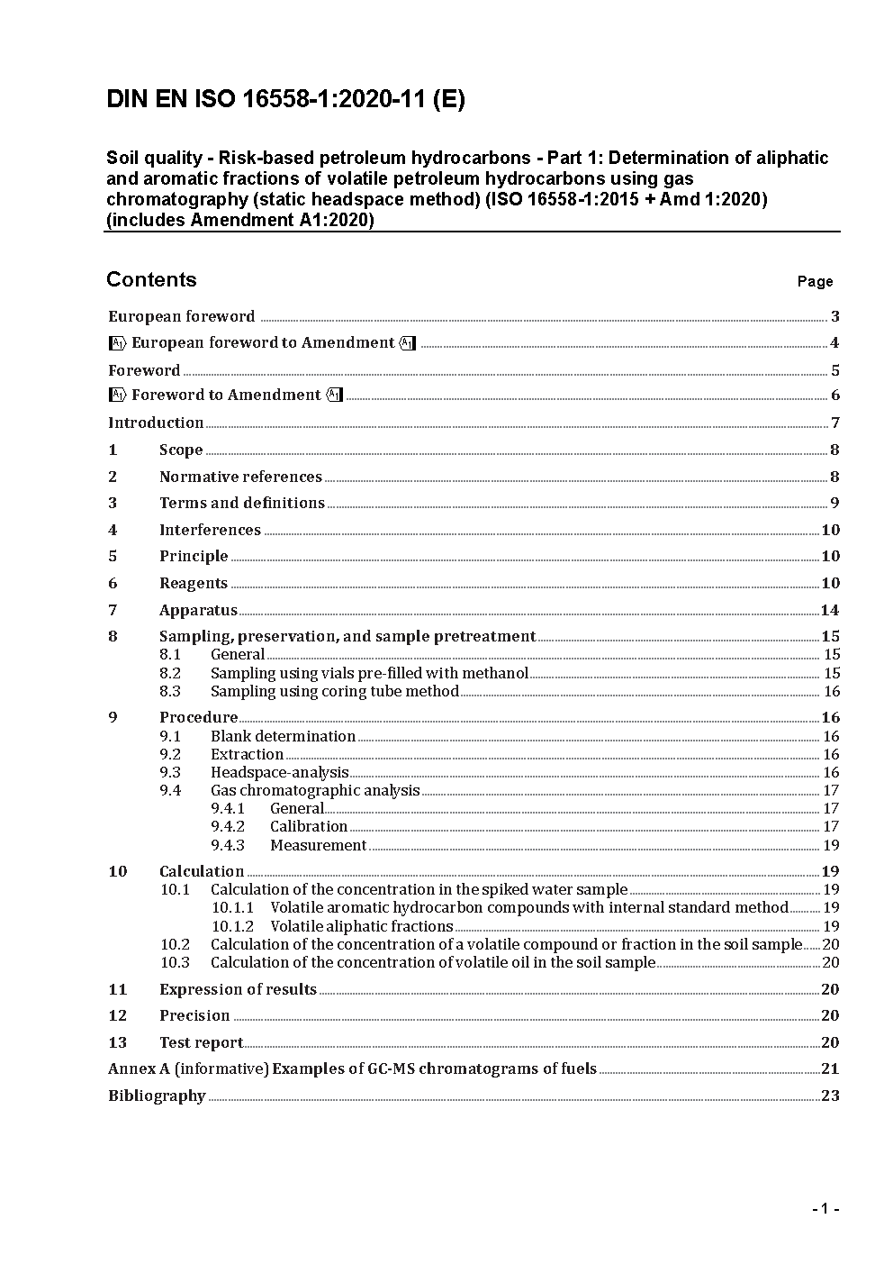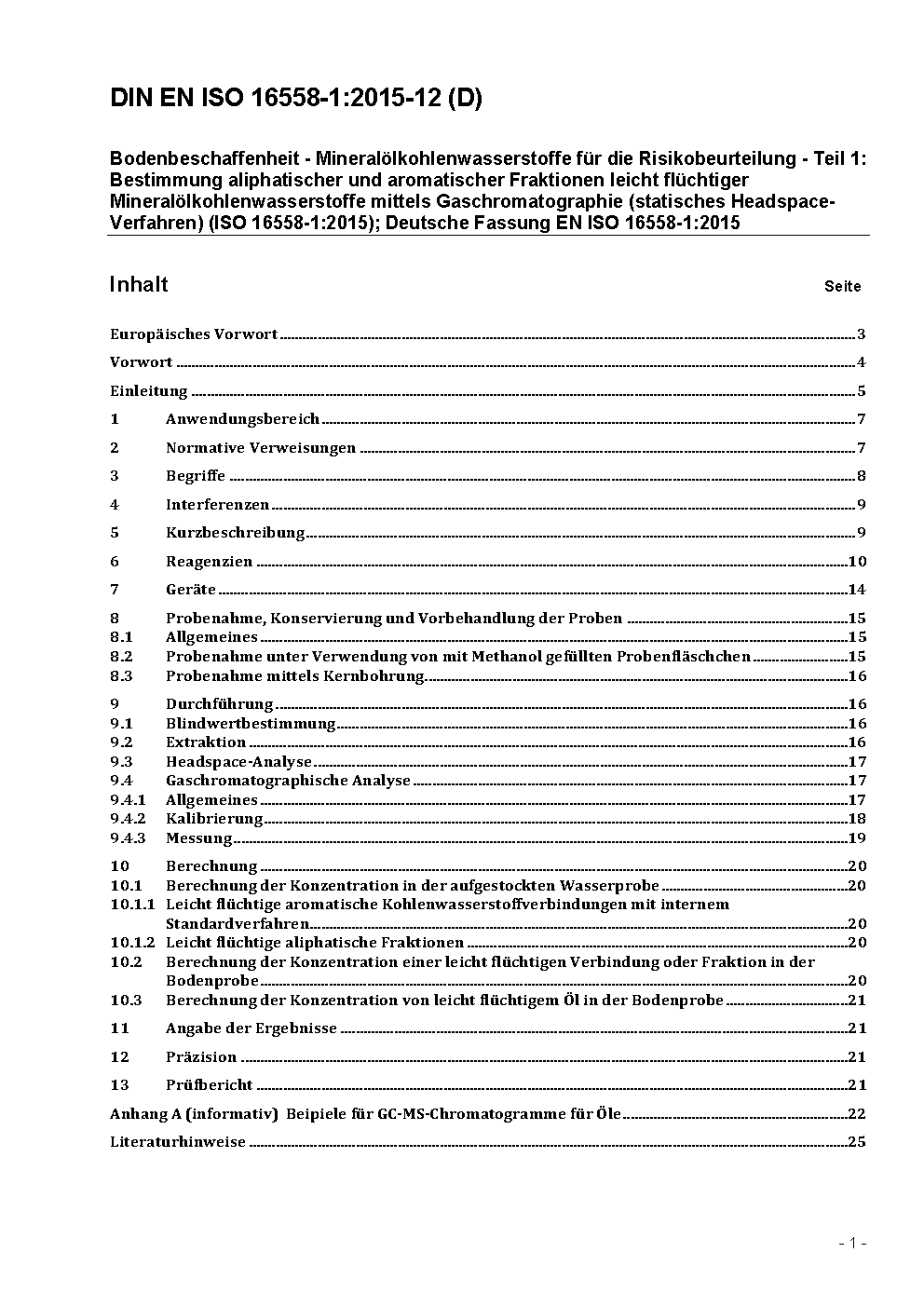Bodenbeschaffenheit - Mineralölkohlenwasserstoffe für die Risikobeurteilung - Teil 1: Bestimmung aliphatischer und aromatischer Fraktionen leicht flüchtiger Mineralölkohlenwasserstoffe mittels Gaschromatographie (statisches Headspace-Verfahren) (ISO 16558-1:2015 + Amd 1:2020); Deutsche Fassung EN ISO 16558-1:2015 + A1:2020