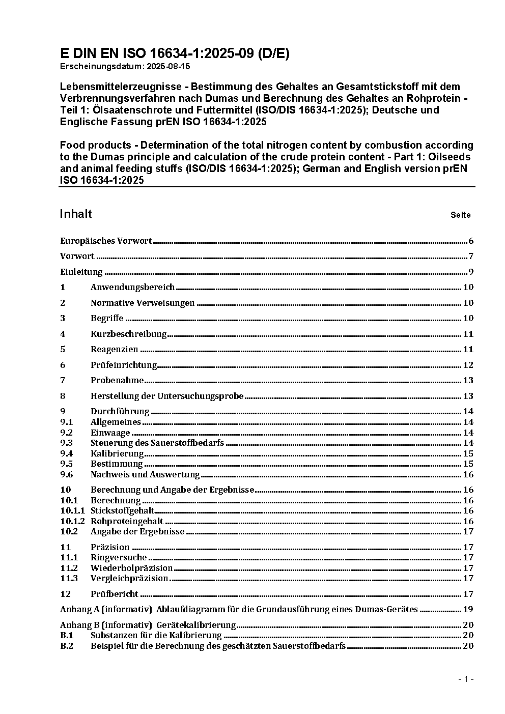 Lebensmittelerzeugnisse - Bestimmung des Gehaltes an Gesamtstickstoff mit dem Verbrennungsverfahren nach Dumas und Berechnung des Gehaltes an Rohprotein - Teil 1: Ölsaatenschrote und Futtermittel (ISO 16634-1:2008); Deutsche Fassung EN ISO 16634-1:2008